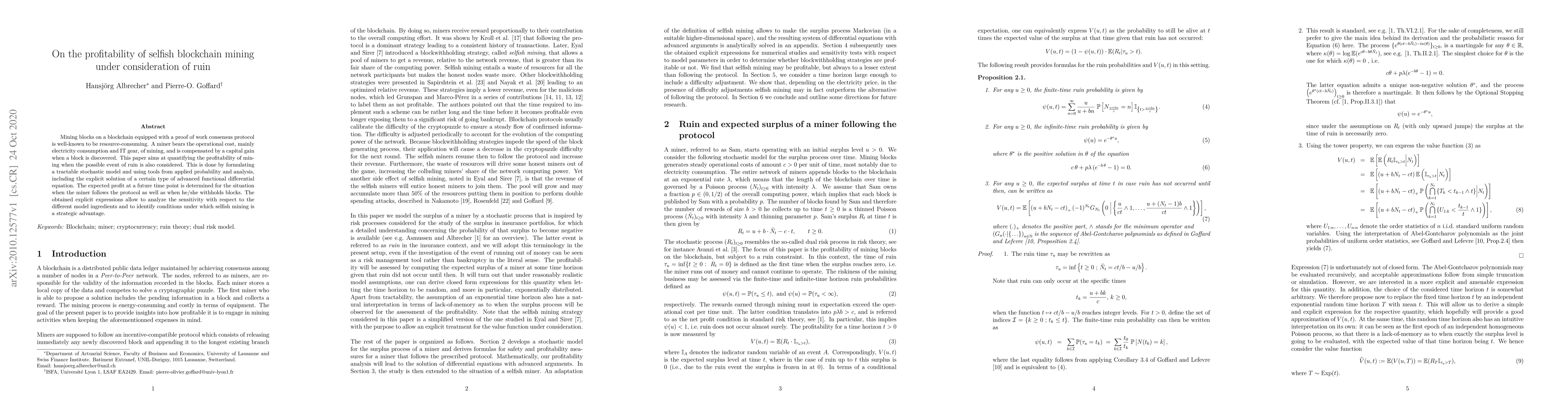 Mining blocks on a blockchain equipped with a proof of work consensus protocol is well-known to be resource-consuming. A miner bears the operational cost, mainly electricity consumption and IT gear, of mining, and is compensated by a capital gain when a block is discovered. This paper aims at quantifying the profitability of mining when the possible event of ruin is also considered. This is done by formulating a tractable stochastic model and using tools from applied probability and analysis, including the explicit solution of a certain type of advanced functional differential equation. The expected profit at a future time point is determined for the situation when the miner follows the protocol as well as when he/she withholds blocks. The obtained explicit expressions allow to analyze the sensitivity with respect to the different model ingredients and to identify conditions under which selfish mining is a strategic advantage.