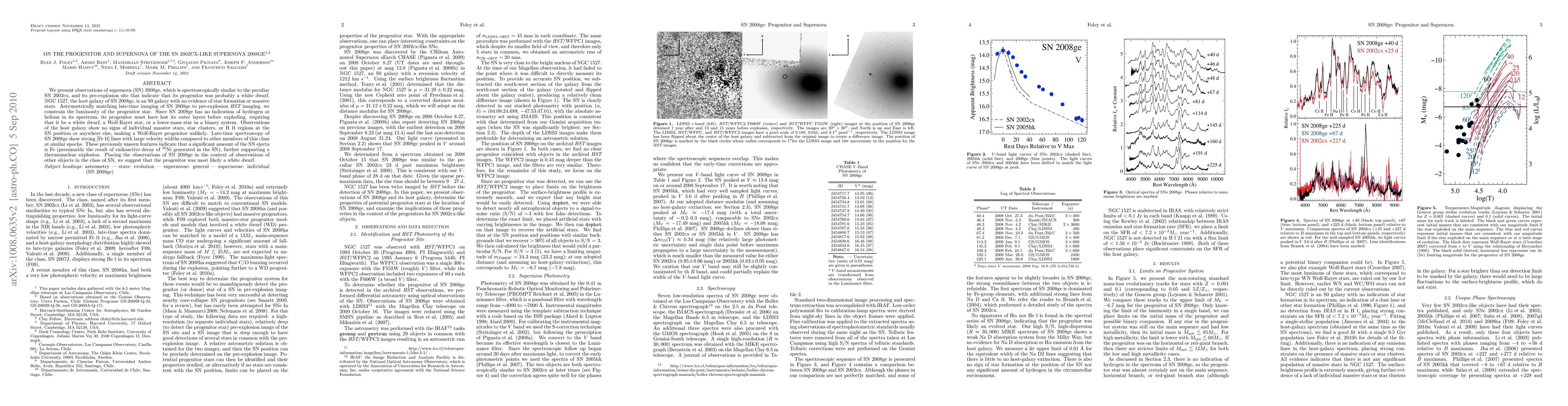 We present observations of supernova (SN) 2008ge, which is spectroscopically similar to the peculiar SN 2002cx, and its pre-explosion site that indicate that its progenitor was probably a white dwarf. NGC 1527, the host galaxy of SN 2008ge, is an S0 galaxy with no evidence of star formation or massive stars. Astrometrically matching late-time imaging of SN 2008ge to pre-explosion HST imaging, we constrain the luminosity of the progenitor star. Since SN 2008ge has no indication of hydrogen or helium in its spectrum, its progenitor must have lost its outer layers before exploding, requiring that it be a white dwarf, a Wolf-Rayet star, or a lower-mass star in a binary system. Observations of the host galaxy show no signs of individual massive stars, star clusters, or H II regions at the SN position or anywhere else, making a Wolf-Rayet progenitor unlikely. Late-time spectroscopy of SN 2008ge show strong [Fe II] lines with large velocity widths compared to other members of this class at similar epochs. These previously unseen features indicate that a significant amount of the SN ejecta is Fe (presumably the result of radioactive decay of 56Ni generated in the SN), further supporting a thermonuclear explosion. Placing the observations of SN 2008ge in the context of observations of other objects in the class of SN, we suggest that the progenitor was most likely a white dwarf.