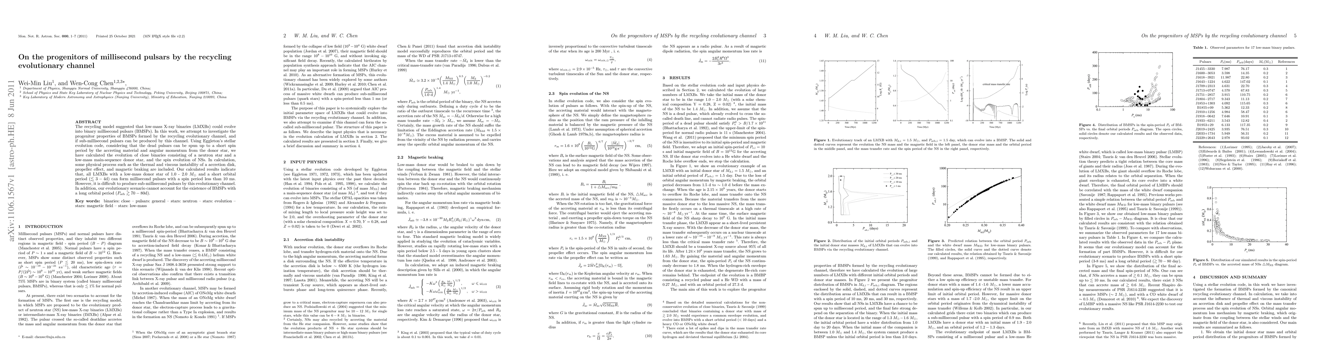 This paper investigates the progenitor properties of millisecond pulsars formed via the recycling evolutionary channel, finding that low-mass X-ray binaries with donor stars of 1.0-2.0 $M_\odot$ and short orbital periods can evolve into millisecond pulsars with spin periods less than 10 ms. However, the study concludes that sub-millisecond pulsars are unlikely to form through this channel and that the evolutionary model does not explain the existence of millisecond pulsars with long orbital periods.