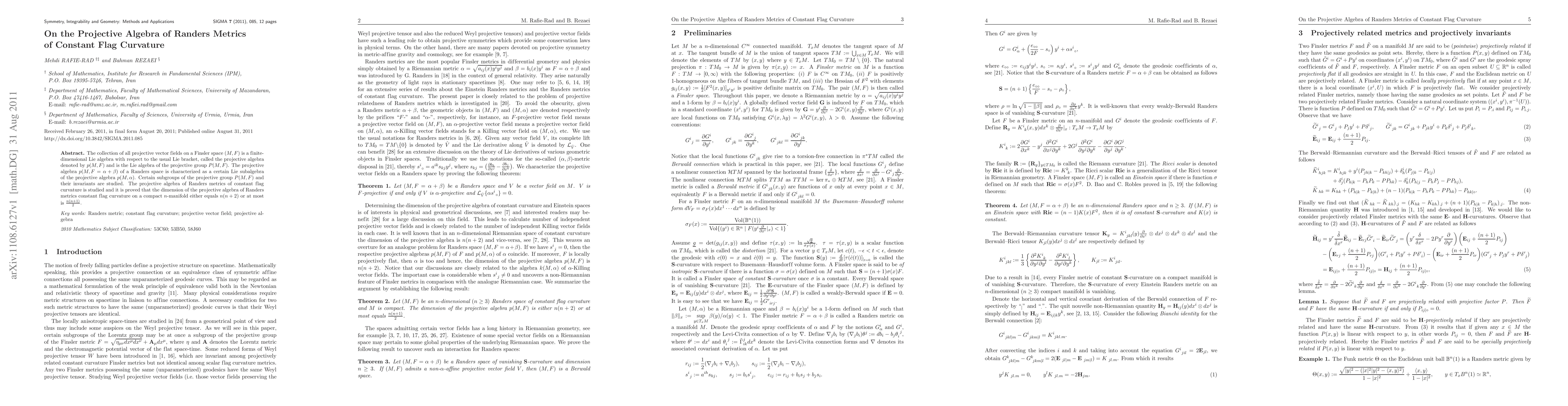 The collection of all projective vector fields on a Finsler space $(M, F)$ is a finite-dimensional Lie algebra with respect to the usual Lie bracket, called the projective algebra denoted by $p(M,F)$ and is the Lie algebra of the projective group $P(M,F)$. The projective algebra $p(M,F=\alpha+\beta)$ of a Randers space is characterized as a certain Lie subalgebra of the projective algebra $p(M,\alpha)$. Certain subgroups of the projective group $P(M,F)$ and their invariants are studied. The projective algebra of Randers metrics of constant flag curvature is studied and it is proved that the dimension of the projective algebra of Randers metrics constant flag curvature on a compact $n$-manifold either equals $n(n+2)$ or at most is $\frac{n(n+1)}{2}$.