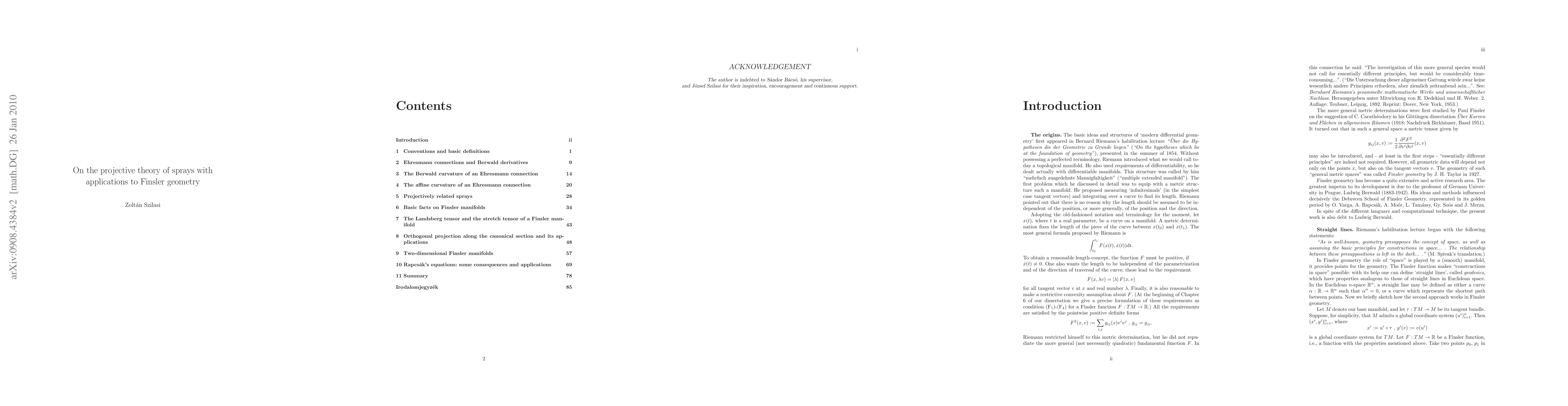 Based on a self-contained, coordinate-free exposition of the necessary concepts and tools of spray and Finsler geometry (with detailed proofs), we derive new results among others on the consequences of the direction-independence of the Landsberg tensor and the stretch tensor of a Finsler manifold. We show that an at least 3-dimensional Finsler manifold with vanishing projected Berwald tensor is a Berwald manifold. To obtain consequences in two dimensions, we transcript Berwald's classical theory on 2-dimensional Finsler manifolds in our setup. We prove criteria and necessary conditions for Finsler-metrizability and projective Finsler-metrizability of a spray. We present new proofs for such classical results as the Berwald - del Castillo - Szab\'o theorem on isotropic Finsler manifolds, the Finslerian Schur lemma, and the uniqueness of the Berwald connection of a Finsler manifold.