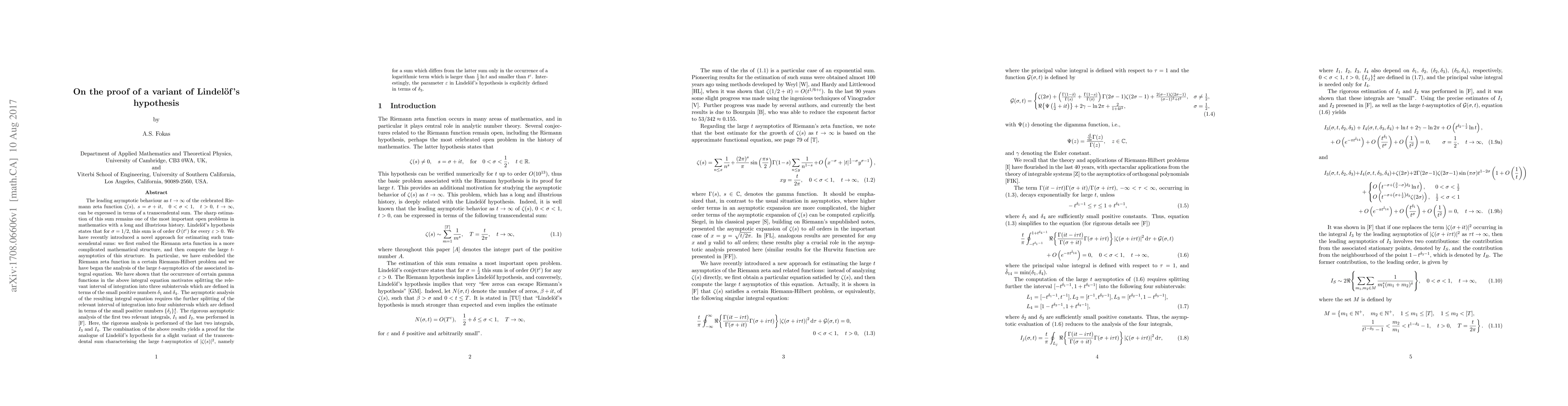 This paper proves a variant of Lindel\"of's hypothesis for a modified transcendental sum characterizing the large $t$-asymptotics of $|\zeta(s)|^2$. The authors employ a novel approach involving embedding the Riemann zeta function in a Riemann-Hilbert problem and analyzing the resulting integral equation's asymptotics.