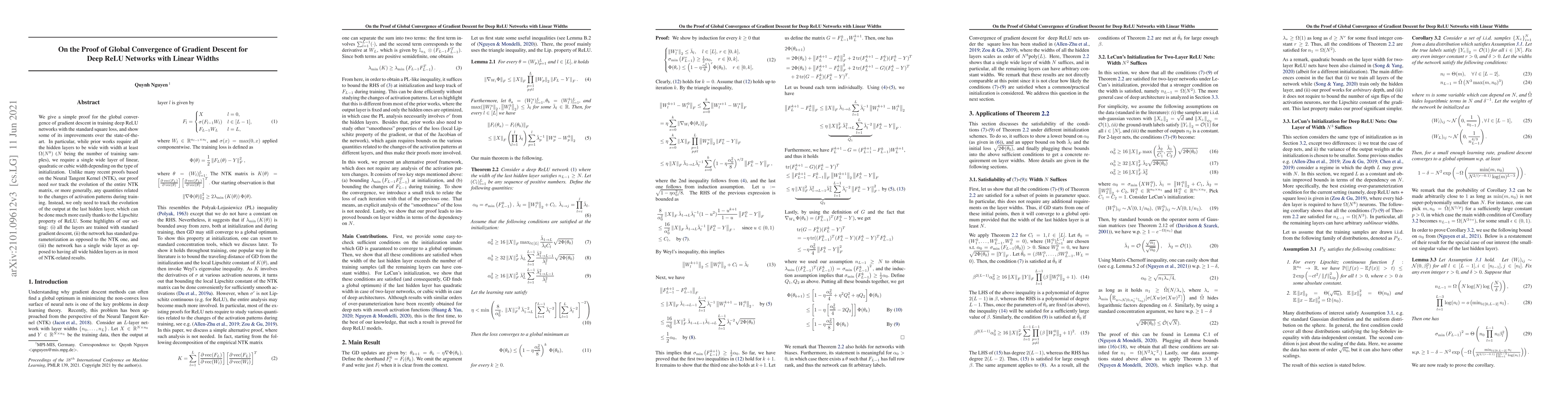 We give a simple proof for the global convergence of gradient descent in training deep ReLU networks with the standard square loss, and show some of its improvements over the state-of-the-art. In particular, while prior works require all the hidden layers to be wide with width at least $\Omega(N^8)$ ($N$ being the number of training samples), we require a single wide layer of linear, quadratic or cubic width depending on the type of initialization. Unlike many recent proofs based on the Neural Tangent Kernel (NTK), our proof need not track the evolution of the entire NTK matrix, or more generally, any quantities related to the changes of activation patterns during training. Instead, we only need to track the evolution of the output at the last hidden layer, which can be done much more easily thanks to the Lipschitz property of ReLU. Some highlights of our setting: (i) all the layers are trained with standard gradient descent, (ii) the network has standard parameterization as opposed to the NTK one, and (iii) the network has a single wide layer as opposed to having all wide hidden layers as in most of NTK-related results.
