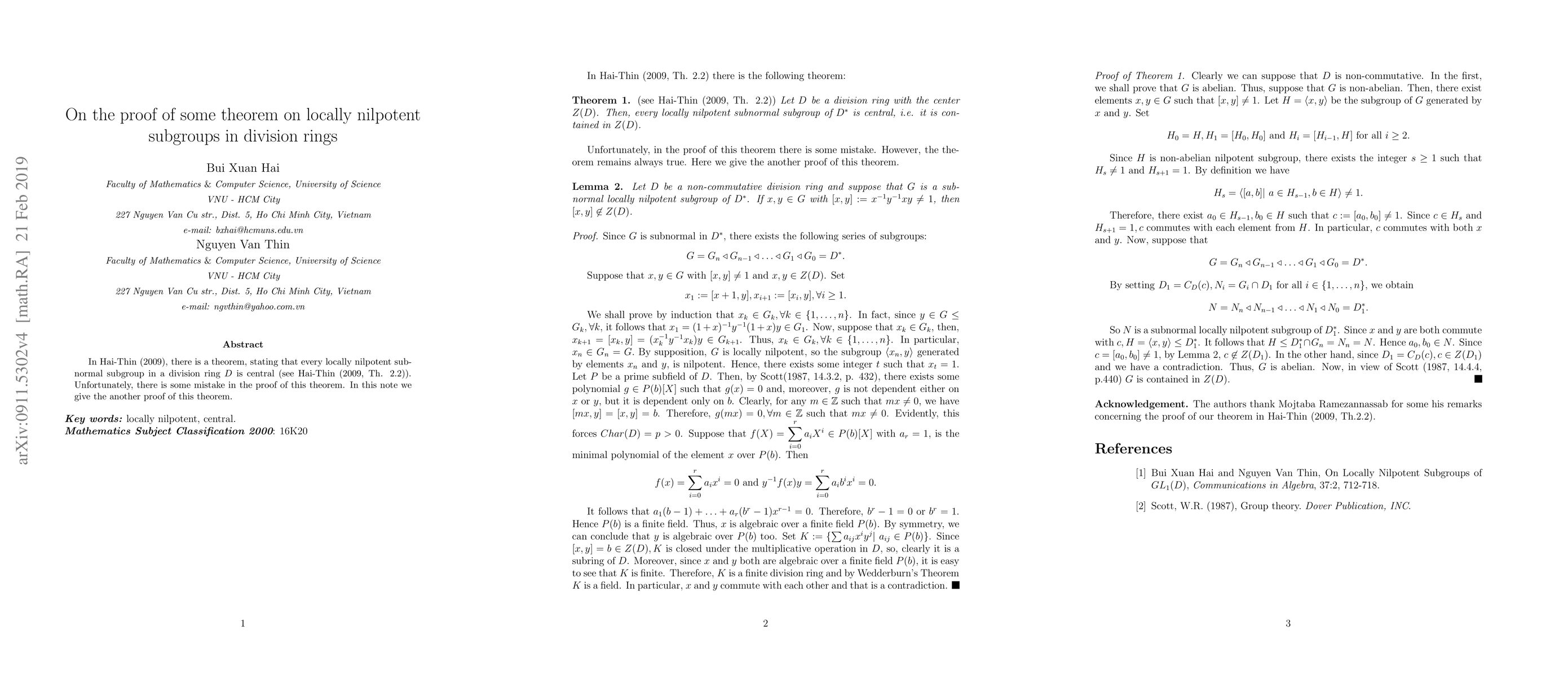 In Hai-Thin (2009), there is a theorem, stating that every locally nilpotent subnormal subgroup in a division ring $D$ is central (see Hai-Thin (2009, Th. 2.2)). Unfortunately, there is some mistake in the proof of this theorem. In this note we give the another proof of this theorem.