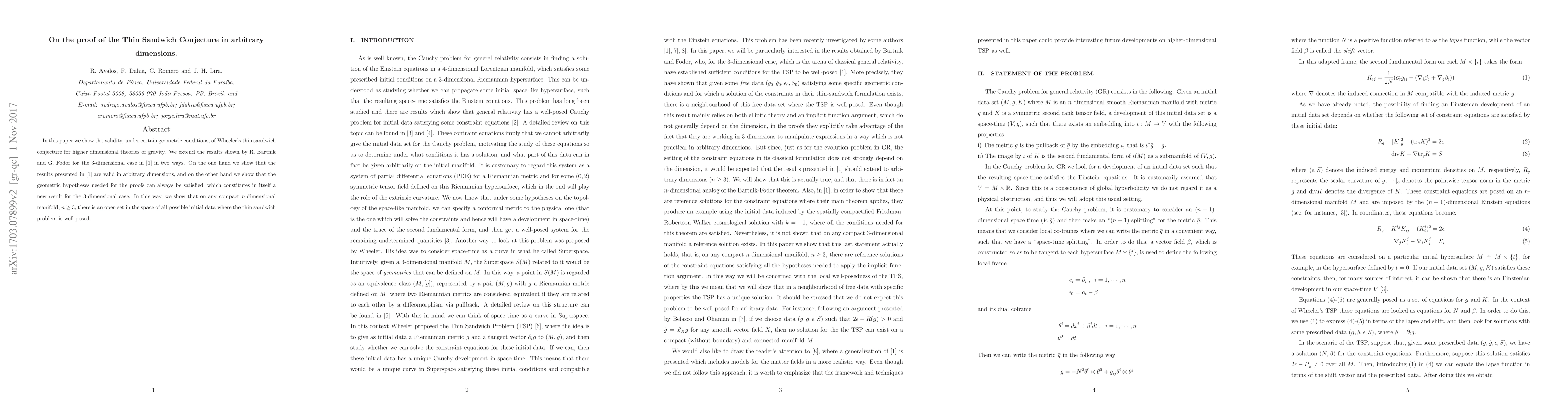 In this paper we show the validity, under certain geometric conditions, of Wheeler's thin sandwich conjecture for higher dimensional theories of gravity. We extend the results shown by R. Bartnik and G. Fodor for the 3-dimensional case in two ways. On the one hand, we show that the results obtained by the mentioned authors are valid in arbitrary dimensions, and on the other hand we show that the geometric hypotheses needed for the proofs can always be satisfied, which constitutes in itself a new result for the 3-dimensional case. In this way, we show that on any compact n-dimensional manifold, n greater or equal to 3, there is an open set in the space of all possible initial data where the thin sandwich problem is well-posed.