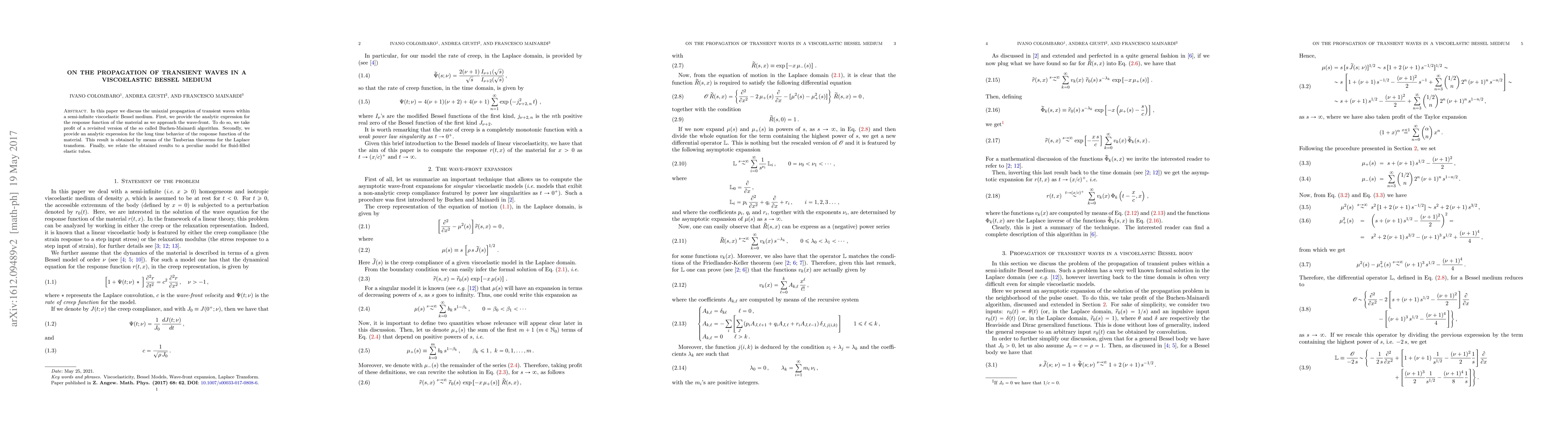 In this paper we discuss the uniaxial propagation of transient waves within a semi-infinite viscoelastic Bessel medium. First, we provide the analytic expression for the response function of the material as we approach the wave-front. To do so, we take profit of a revisited version of the so called Buchen-Mainardi algorithm. Secondly, we provide an analytic expression for the long time behavior of the response function of the material. This result is obtained by means of the Tauberian theorems for the Laplace transform. Finally, we relate the obtained results to a peculiar model for fluid-filled elastic tubes.