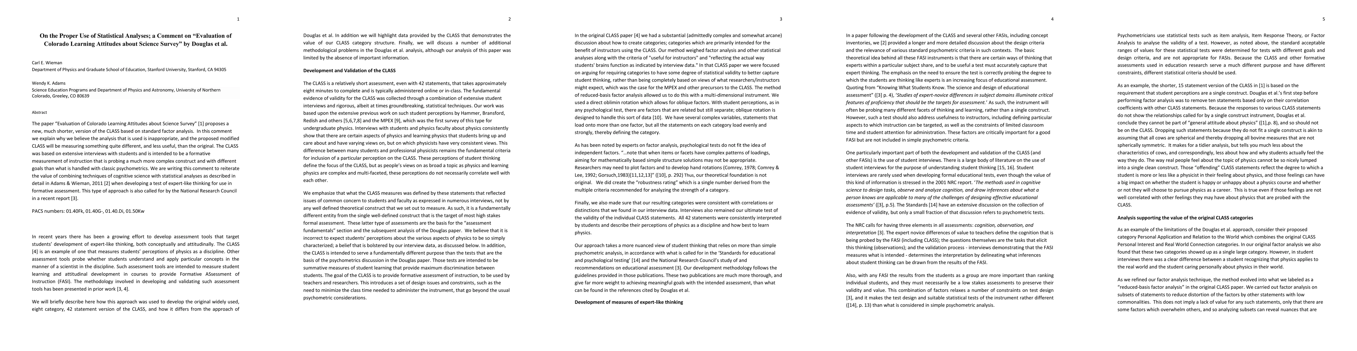 The paper "Evaluation of Colorado Learning Attitudes about Science Survey" [1] proposes a new, much shorter, version of the CLASS based on standard factor analysis. In this comment we explain why we believe the analysis that is used is inappropriate, and the proposed modified CLASS will be measuring something quite different, and less useful, than the original. The CLASS was based on extensive interviews with students and is intended to be a formative measurement of instruction that is probing a much more complex construct and with different goals than what is handled with classic psychometrics. We are writing this comment to reiterate the value of combining techniques of cognitive science with statistical analyses as described in detail in Adams & Wieman, 2011 [2] when developing a test of expert-like thinking for use in formative assessment. This type of approach is also called for by the National Research Council in a recent report [3].