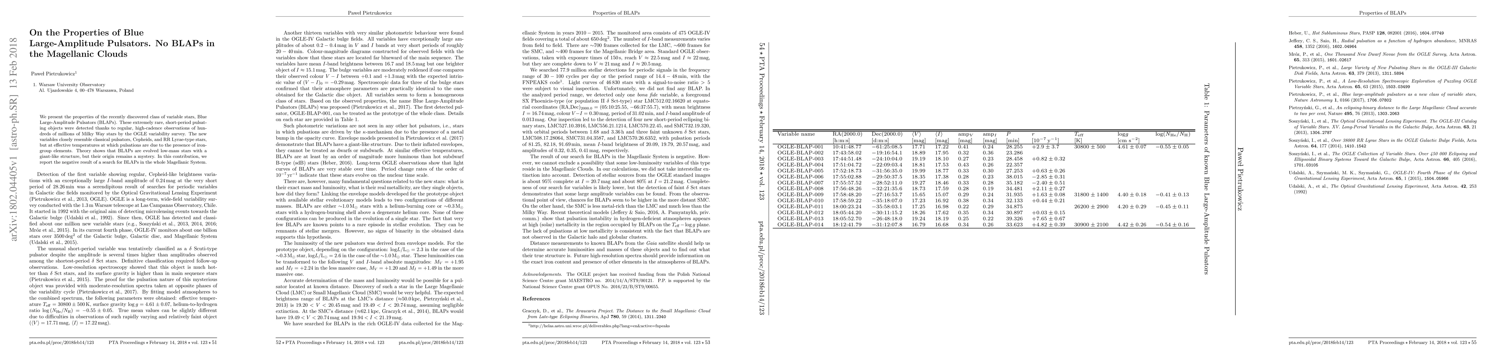 This paper discusses the properties of Blue Large-Amplitude Pulsators (BLAPs), rare variable stars discovered in the Milky Way, and reports the absence of BLAPs in the Magellanic Clouds, suggesting their unique origin may be tied to the Milky Way's environment.