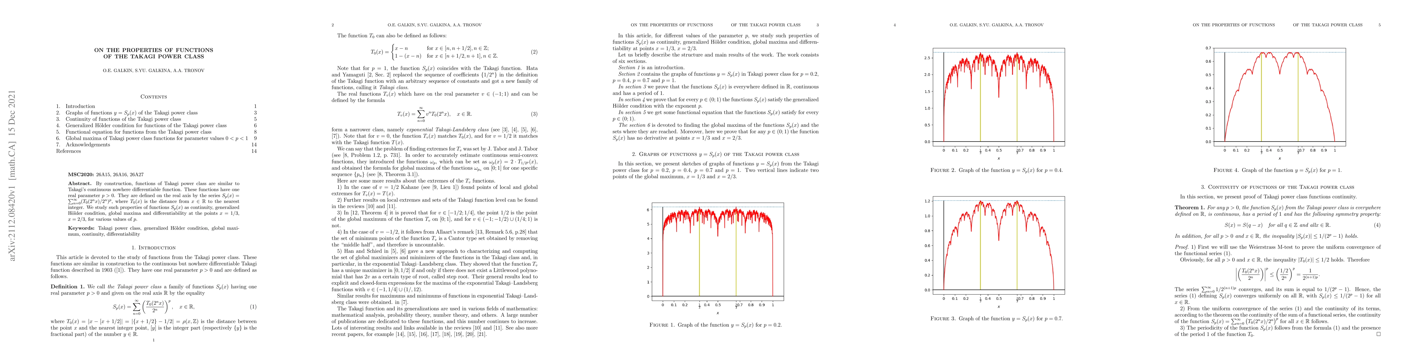 This paper investigates functions of the Takagi power class, defined by a series involving Takagi's continuous nowhere differentiable function, focusing on their continuity, generalized H\"older condition, global maxima, and differentiability at specific points for different values of $p$.