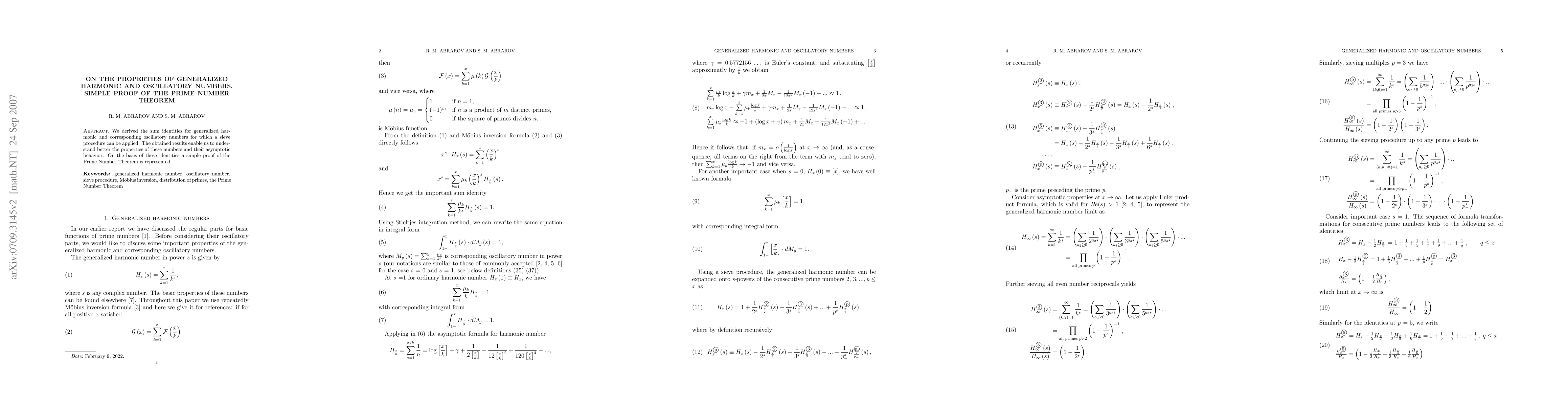 We derived the sum identities for generalized harmonic and corresponding oscillatory numbers for which a sieve procedure can be applied. The obtained results enable us to understand better the properties of these numbers and their asymptotic behavior. On the basis of these identities a simple proof of the Prime Number Theorem is represented.