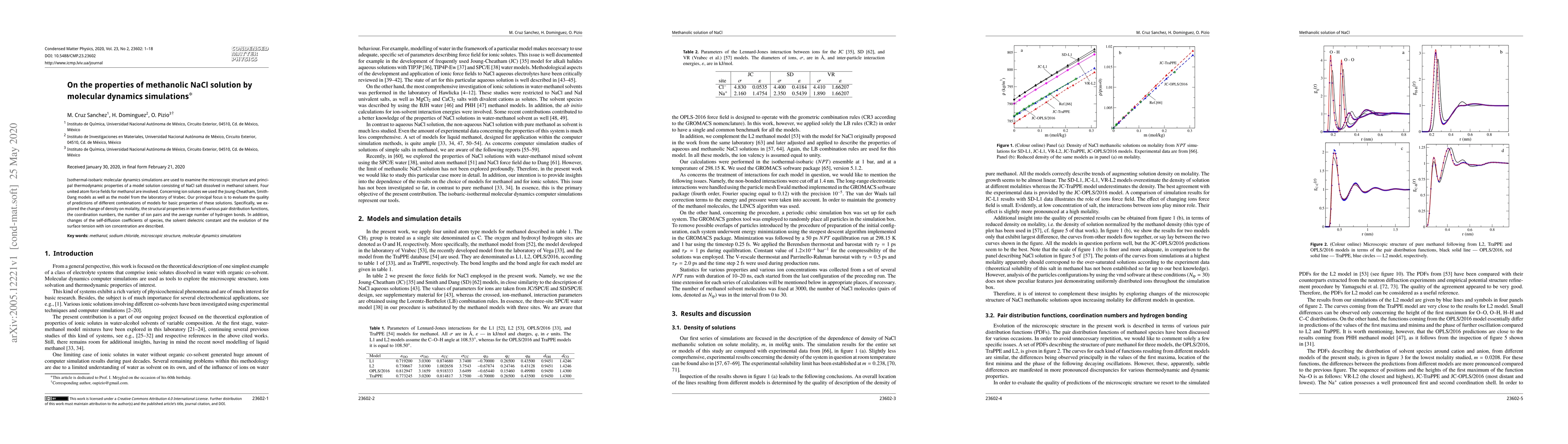 This study uses molecular dynamics simulations to analyze the microscopic structure and thermodynamic properties of NaCl dissolved in methanol solvent, evaluating various force fields. The research focuses on density, structural properties, ion pair interactions, and diffusion coefficients, aiming to assess the accuracy of different model combinations for predicting solution behavior.