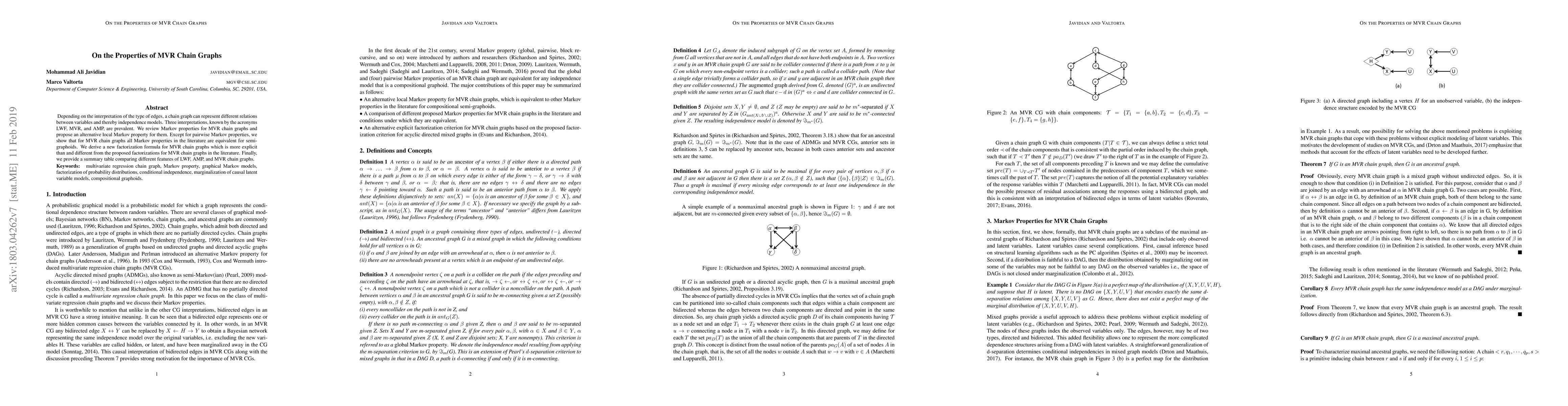 This paper reviews Markov properties for Multivariate Regression Chain Graphs (MVR CGs), proposing new global and local Markov properties. It also introduces a new, more explicit factorization formula for MVR CGs, and compares features of LWF, AMP, and MVR chain graphs in a summary table.