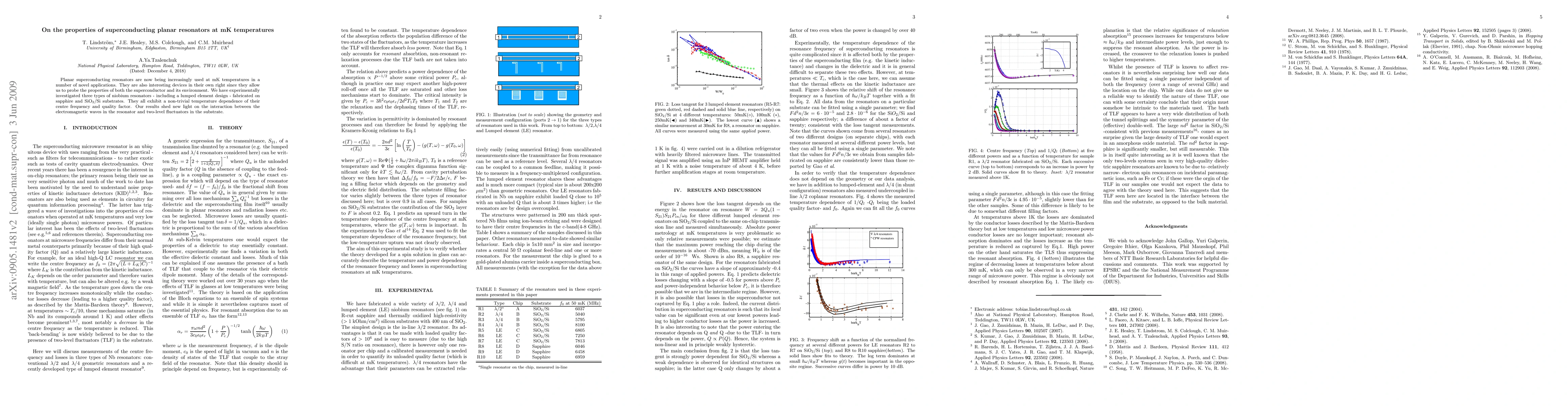 This paper investigates the properties of superconducting planar resonators at millikelvin temperatures, focusing on three types of niobium resonators. The study reveals a non-trivial temperature dependence of their center frequency and quality factor, providing insights into the interaction between electromagnetic waves and two-level fluctuators in the substrate.