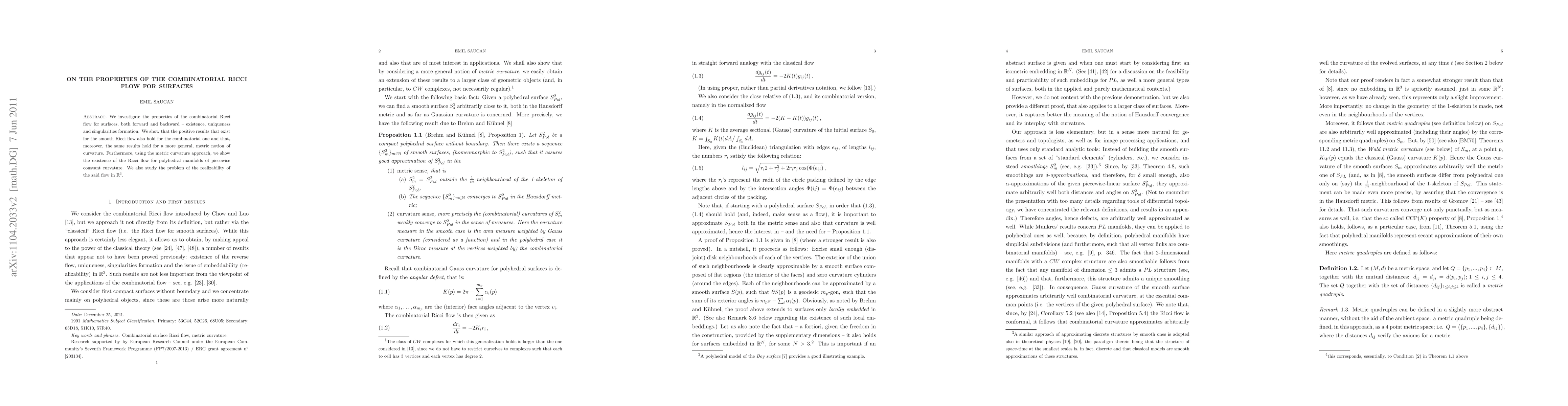 The paper investigates properties of combinatorial Ricci flow for surfaces, showing existence, uniqueness, and singularity formation, with implications for polyhedral manifolds and realizability in 3D space.