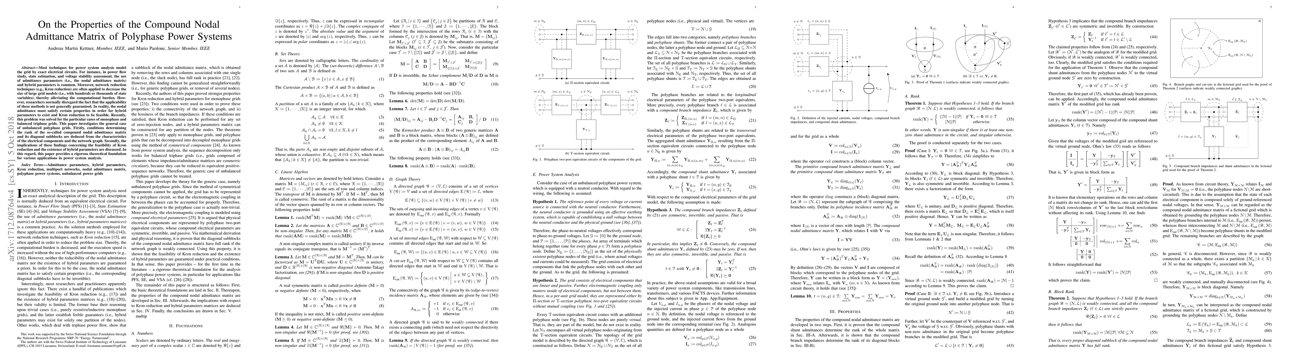 This paper investigates the properties of the compound nodal admittance matrix for unbalanced polyphase power systems, deducing conditions for its rank and diagonal subblocks. It discusses the implications for the feasibility of Kron reduction and the existence of hybrid parameters, providing a theoretical foundation for power system analysis techniques.