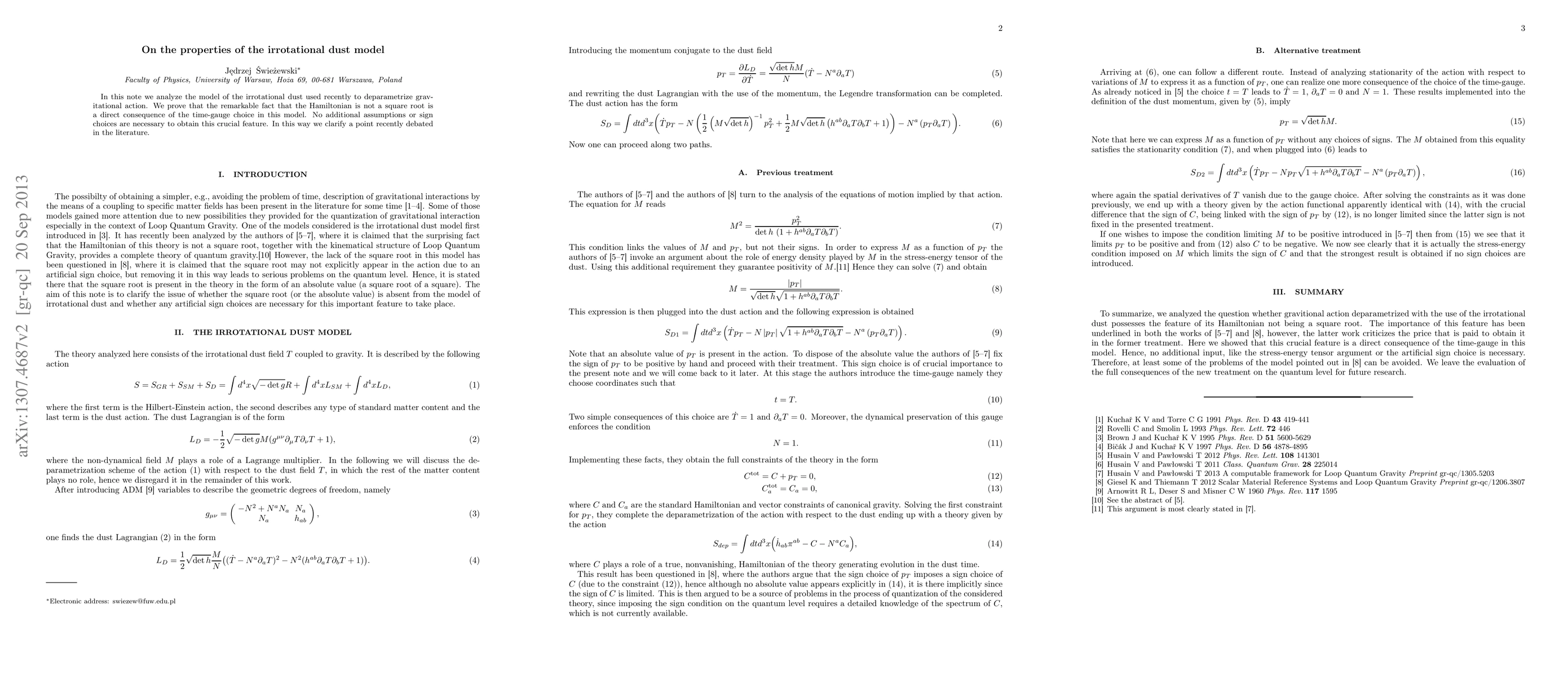 Researchers clarify a key property of the irrotational dust model, showing that its Hamiltonian is not a square root due to the chosen time-gauge, without requiring additional assumptions or sign choices.