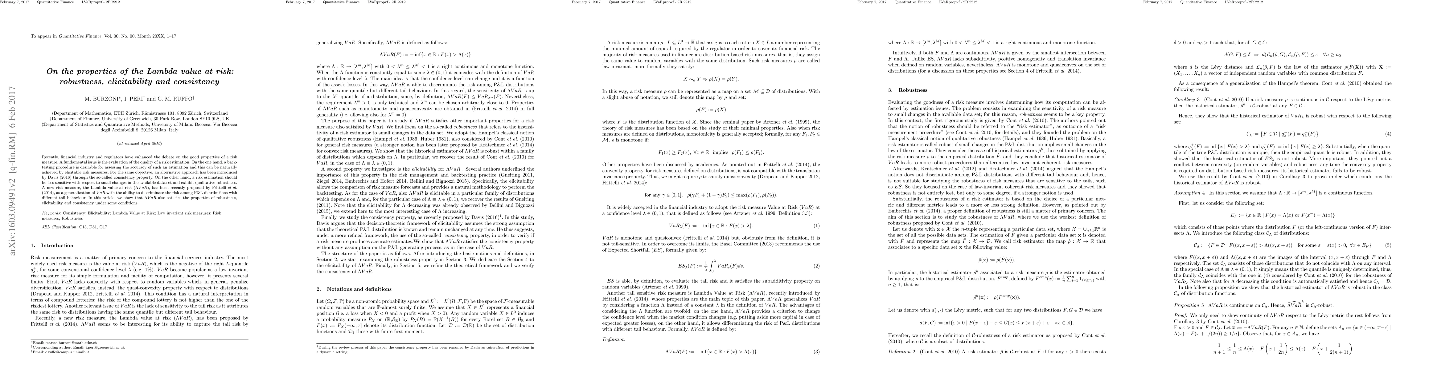 The Lambda value at risk (Lambda VaR) meets robustness, elicitability, and consistency properties under certain conditions, making it a viable risk measure for financial estimation and regulation.