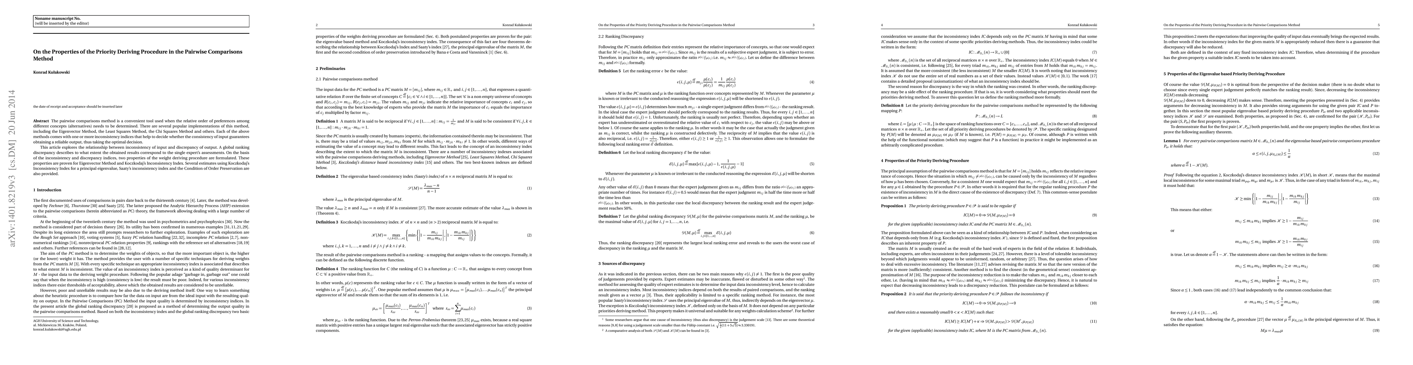This paper investigates the relationship between input inconsistency and output discrepancy in the pairwise comparisons method, focusing on the Eigenvector Method and Koczkodaj's Inconsistency Index. It formulates and proves two properties of the weight deriving procedure, providing estimates for principal eigenvalues and consistency indices.