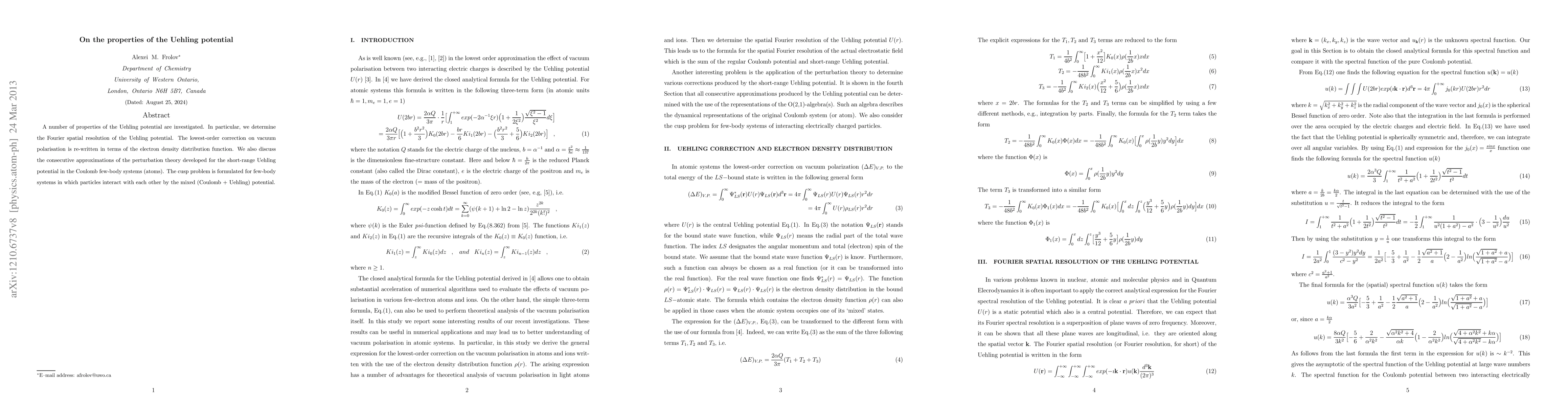 A number of properties of the Uehling potential are investigated. In particular, we determine the Fourier spatial resolution of the Uehling potential. The lowest-order correction on vacuum polarisation is re-written in terms of the electron density distribution function. We also discuss the consecutive approximations of the perturbation theory developed for the short-range Uehling potential in the Coulomb few-body systems (atoms). The cusp problem is formulated for few-body systems in which particles interact with each other by the mixed (Coulomb + Uehling) potential.