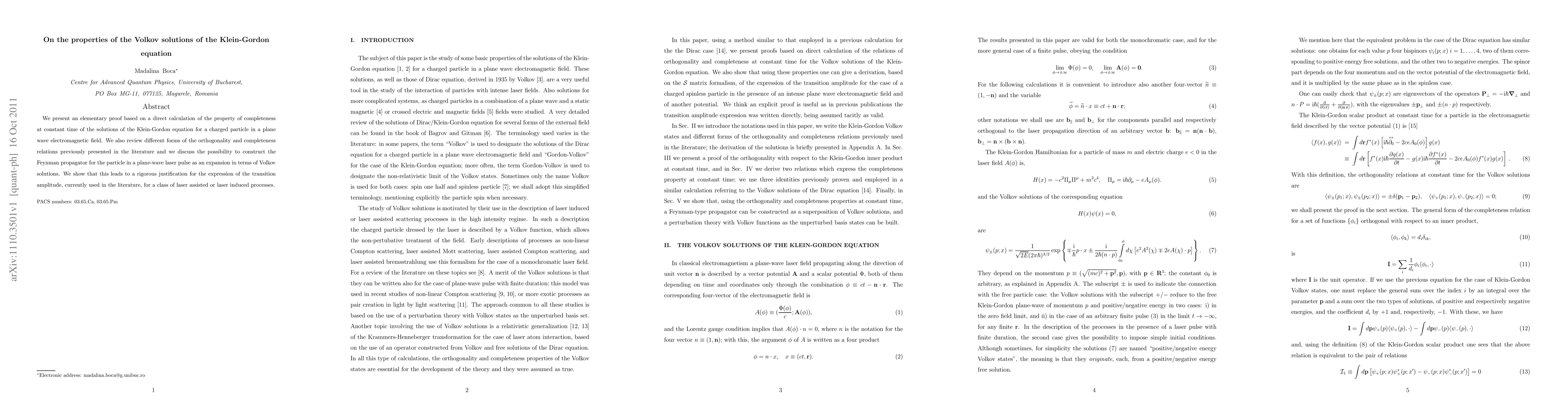This paper provides an elementary proof of the completeness of Volkov solutions for the Klein-Gordon equation in a plane wave electromagnetic field, and discusses the construction of the Feynman propagator using these solutions, justifying the transition amplitude expression used in laser-assisted processes.