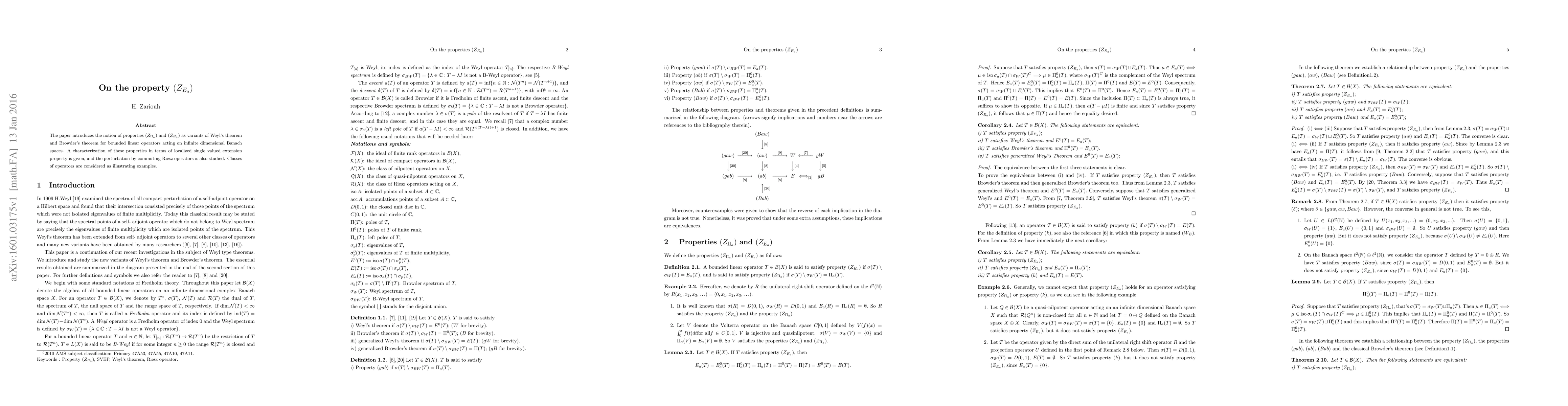 The paper introduces the notion of properties $(Z_{\Pi_a})$ and $(Z_{E_a})$ as variants of Weyl's theorem and Browder's theorem for bounded linear operators acting on infinite dimensional Banach spaces. A characterization of these properties in terms of localized single valued extension property is given, and the perturbation by commuting Riesz operators is also studied. Classes of operators are considered as illustrating examples.