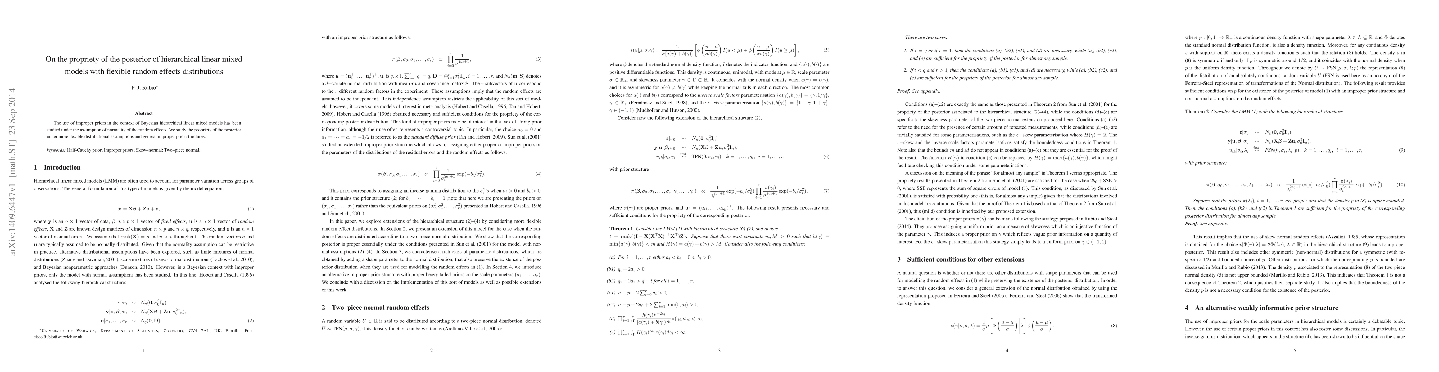 This paper investigates the propriety of the posterior distribution in Bayesian hierarchical linear mixed models when using flexible random effects distributions and general improper prior structures, moving beyond the traditional normality assumption. It aims to understand the implications of these more flexible assumptions on the model's posterior behavior.