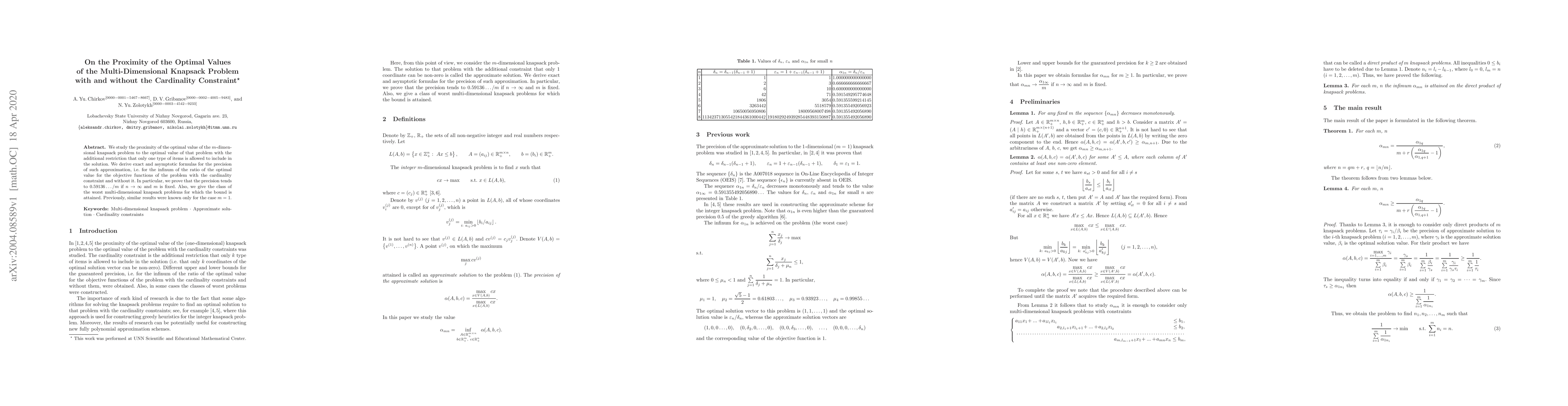 We study the proximity of the optimal value of the m-dimensional knapsack problem to the optimal value of that problem with the additional restriction that only one type of items is allowed to include in the solution. We derive exact and asymptotic formulas for the precision of such approximation, i.e. for the infinum of the ratio of the optimal value for the objective functions of the problem with the cardinality constraint and without it. In particular, we prove that the precision tends to 0.59136.../m if n tends to infinity and m is fixed. Also, we give the class of the worst multi-dimensional knapsack problems for which the bound is attained. Previously, similar results were known only for the case m=1.
