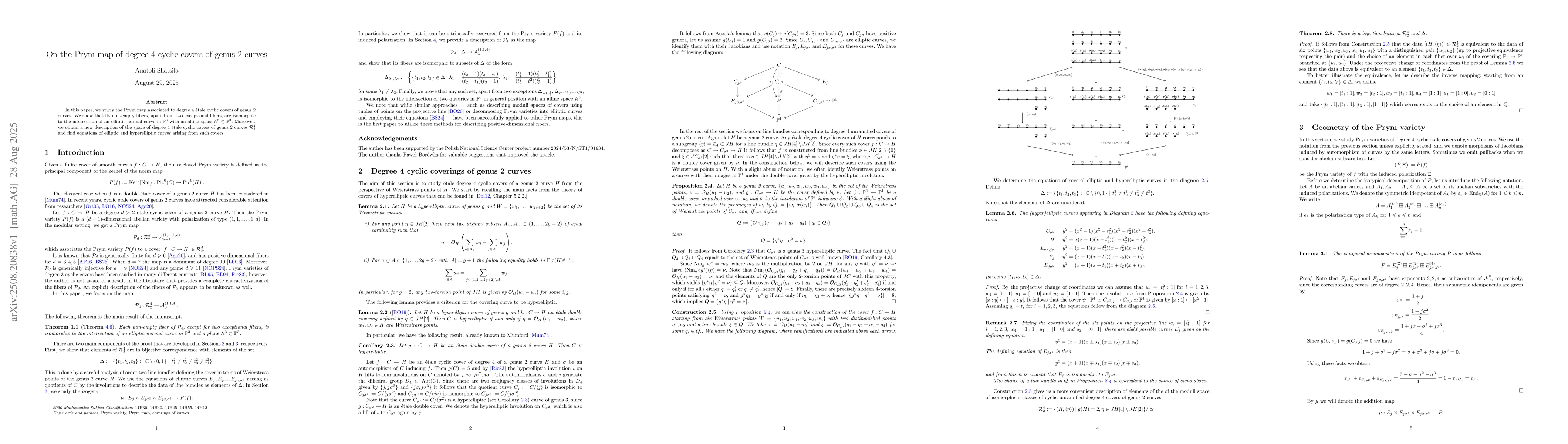 In this paper, we study the Prym map associated to degree 4 \'etale cyclic covers of genus 2 curves. We show that its non-empty fibers, apart from two exceptional fibers, are isomorphic to the intersection of an elliptic normal curve in $\mathbb{P}^3$ with an affine space $\mathbb{A}^3 \subset \mathbb{P}^3$. Moreover, we obtain a new description of the space of degree 4 \'etale cyclic covers of genus 2 curves $\mathcal{R}_2^4$ and find equations of elliptic and hyperelliptic curves arising from such covers.