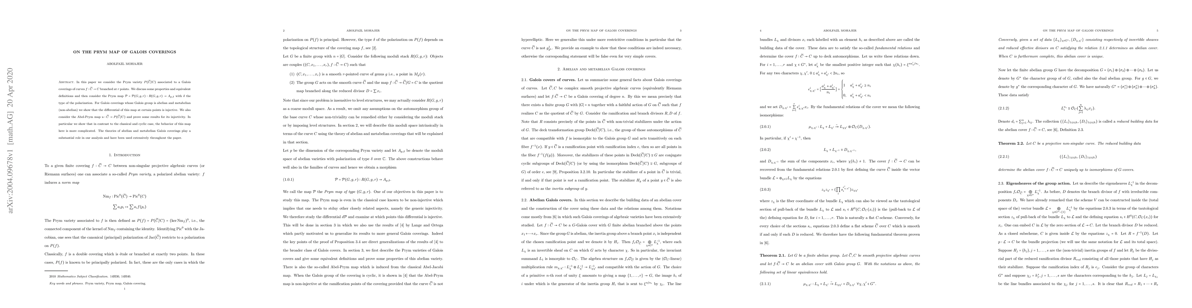 This paper examines the Prym map associated with Galois coverings of curves, focusing on properties and definitions of the Prym variety for abelian and metabelian groups. It shows that the differential of the Prym map is injective under certain conditions and explores the complexity of the Abel-Prym map in non-classical settings.