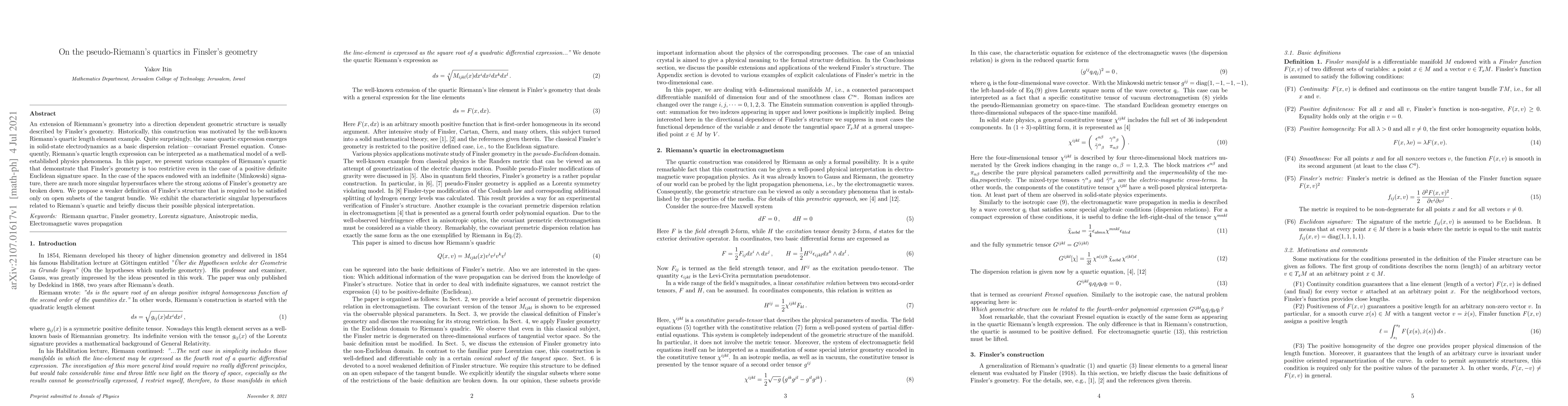 An extension of Riemmann's geometry into a direction dependent geometric structure is usually described by Finsler's geometry. Historically, this construction was motivated by the well-known Riemann's quartic length element example. Quite surprisingly, the same quartic expression emerges in solid-state electrodynamics as a basic dispersion relation -- covariant Fresnel equation. Consequently, Riemann's quartic length expression can be interpreted as a mathematical model of a well-established physics phenomena. In this paper, we present various examples of Riemann's quartic that demonstrate that Finsler's geometry is too restrictive even in the case of a positive definite Euclidean signature space. In the case of the spaces endowed with an indefinite (Minkowski) signature, there are much more singular hypersurfaces where the strong axioms of Finsler's geometry are broken down. We propose a weaker definition of Finsler's structure that is required to be satisfied only on open subsets of the tangent bundle. We exhibit the characteristic singular hypersurfaces related to Riemann's quartic and briefly discuss their possible physical interpretation.