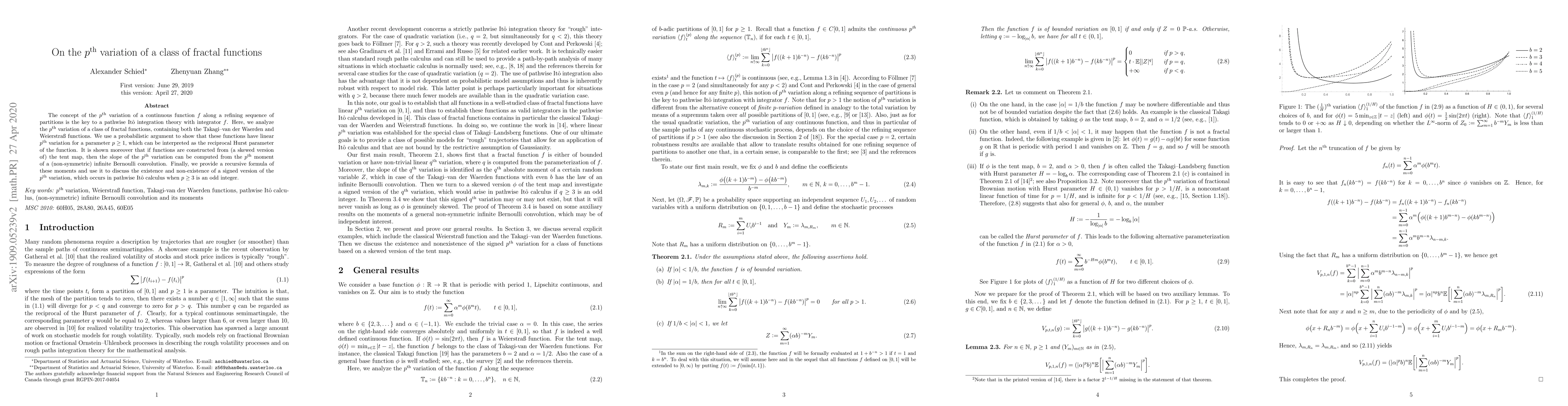 The concept of the $p^{\text{th}}$ variation of a continuous function $f$ along a refining sequence of partitions is the key to a pathwise It\^o integration theory with integrator $f$. Here, we analyze the $p^{\text{th}}$ variation of a class of fractal functions, containing both the Takagi--van der Waerden and Weierstra\ss\ functions. We use a probabilistic argument to show that these functions have linear $p^{\text{th}}$ variation for a parameter $p\ge1$, which can be interpreted as the reciprocal Hurst parameter of the function. It is shown moreover that if functions are constructed from (a skewed version of) the tent map, then the slope of the $p^{\text{th}}$ variation can be computed from the $p^{\text{th}}$ moment of a (non-symmetric) infinite Bernoulli convolution. Finally, we provide a recursive formula of these moments and use it to discuss the existence and non-existence of a signed version of the $p^{\text{th}}$ variation, which occurs in pathwise It\^o calculus when $p\ge3$ is an odd integer.