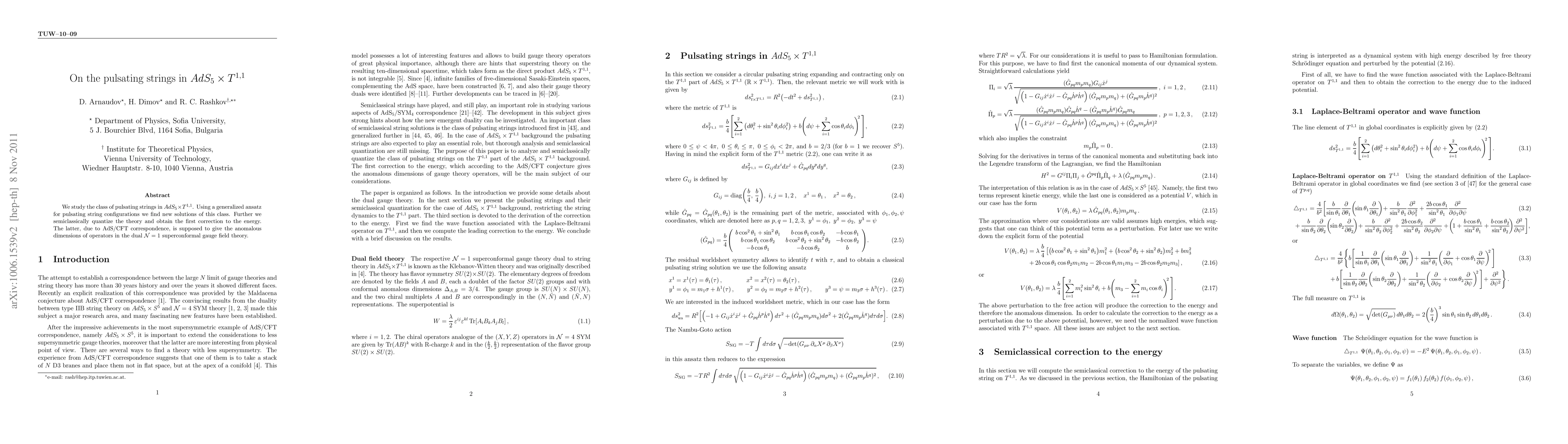 The study investigates pulsating strings in AdS_5 x T^{1,1} using a generalized ansatz for pulsating string configurations. The Hamiltonian formulation is employed, and the theory is semiclassically quantized to find the first correction to the energy, which corresponds to anomalous dimensions of operators in the dual N=1 superconformal gauge field theory.