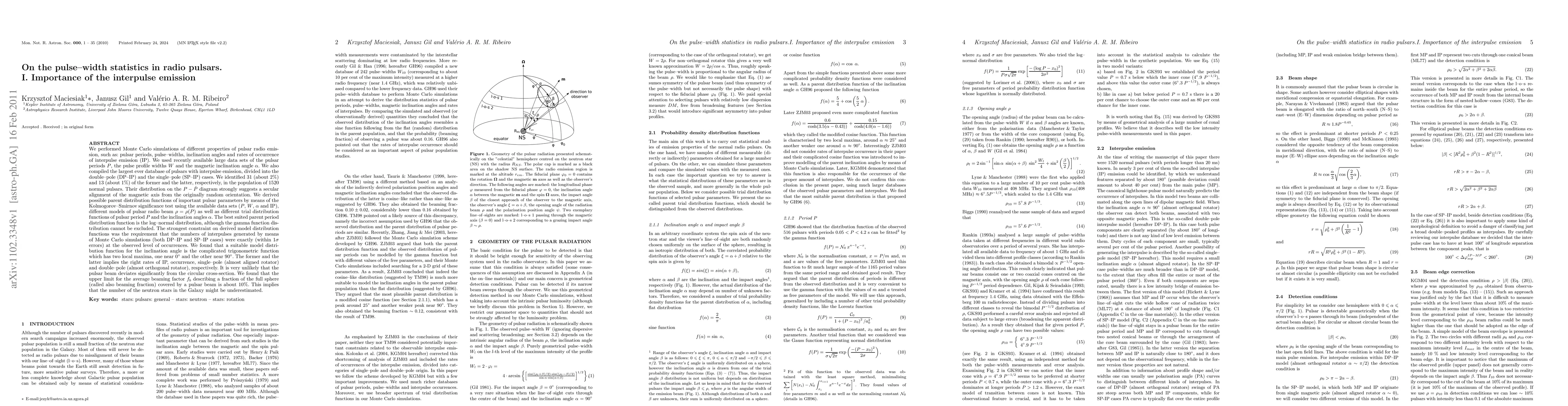 We performed Monte Carlo simulations of different properties of pulsar radio emission, such as: pulsar periods, pulse-widths, inclination angles and rates of occurrence of interpulse emission (IP). We used recently available large data sets of the pulsar periods P, the pulse profile widths W and the magnetic inclination angle alpha. We also compiled the largest ever database of pulsars with interpulse emission, divided into the double-pole (DP-IP) and the single-pole (SP-IP) cases. Their distribution on the P - Pdot diagram strongly suggests a secular alignment of the magnetic axis from the originally random orientation. We derived possible parent distribution functions of important pulsar parameters by means of the Kolmogorov-Smirnov significance test using the available data sets (P, W, alpha and IP), different models of pulsar radio beam rho = rho(P) as well as different trial distribution functions of pulsar period and the inclination angles. The best suited parent period distribution function is the log-normal distribution, although the gamma function distribution cannot be excluded. The strongest constraint on derived model distribution functions was the requirement that the numbers of interpulses were exactly (within 1sigma errors) at the observed level of occurrences. We found that a suitable model distribution function for the inclination angle is the complicated trigonometric function which has two local maxima, one near 0 deg and the other near 90 deg. The former and the latter implies the right rates of IP occurrence. It is very unlikely that the pulsar beam deviates significantly from the circular cross-section. We found that the upper limit for the average beaming factor fb describing a fraction of the full sphere (called also beaming fraction) covered by a pulsar beam is about 10%. This implies that the number of the neutron stars in the Galaxy might be underestimated.