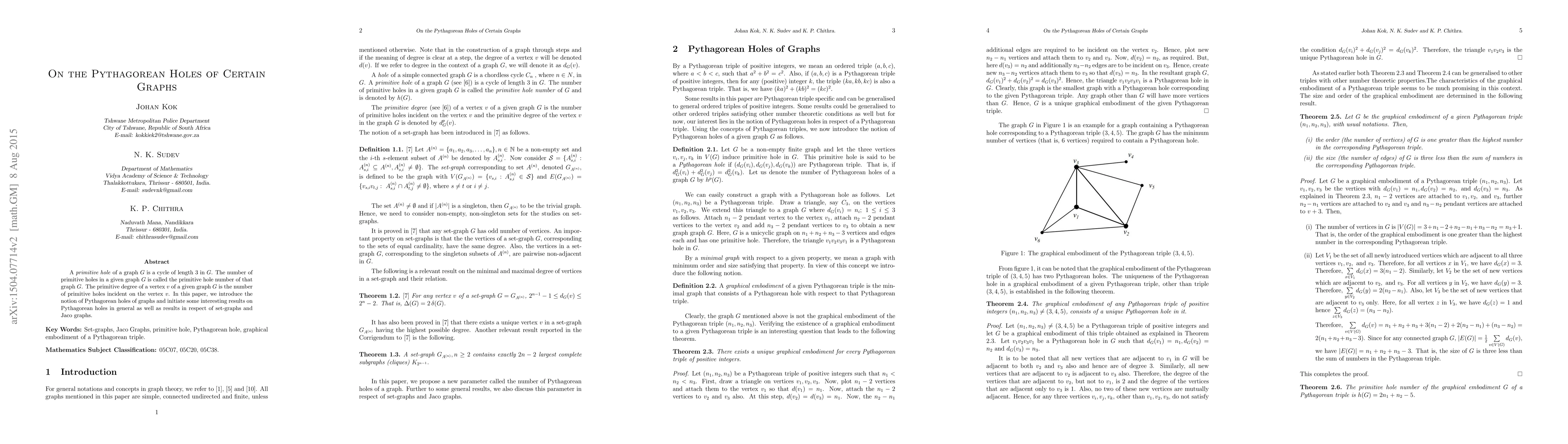 A \emph{primitive hole} of a graph $G$ is a cycle of length 3 in $G$. The number of primitive holes in a given graph $G$ is called the primitive hole number of the graph $G$. The primitive degree of a vertex $v$ of a given graph $G$ is the number of primitive holes incident on the vertex $v$. In this paper, we introduce the notion of Pythagorean holes of graphs and initiate some interesting results on Pythagorean holes in general as well as results in respect of set-graphs and Jaco graphs.