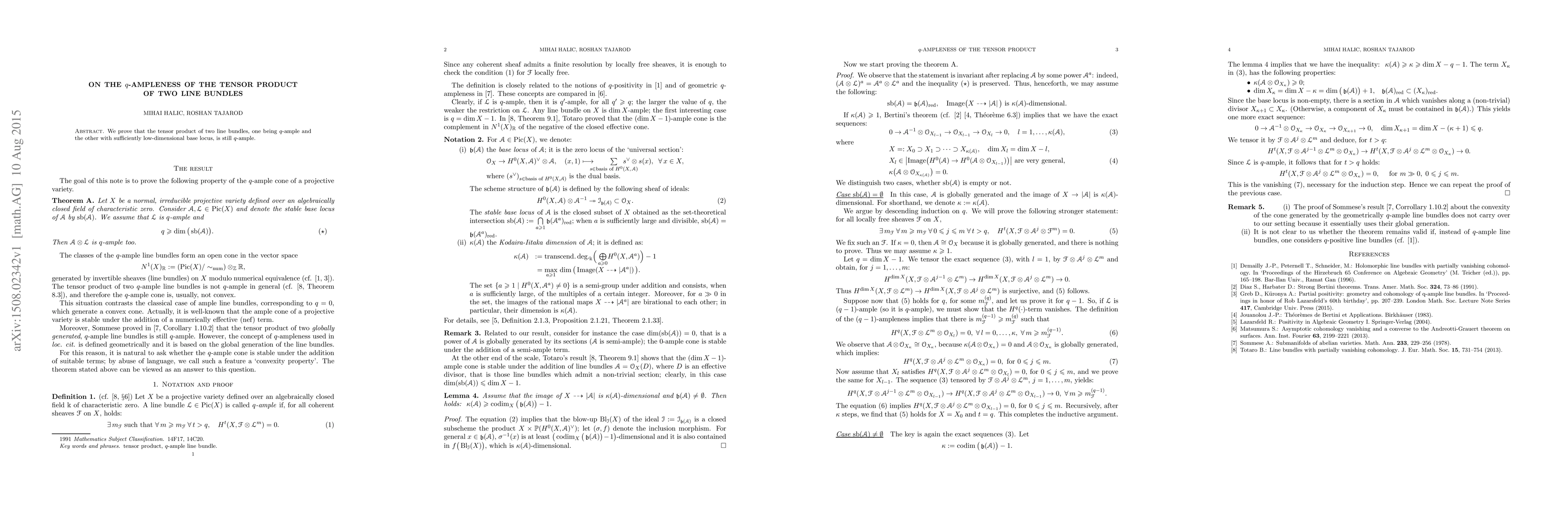We prove that the tensor product of two line bundles, one being $q$-ample and the other with sufficiently low-dimensional base locus, is still $q$-ample.