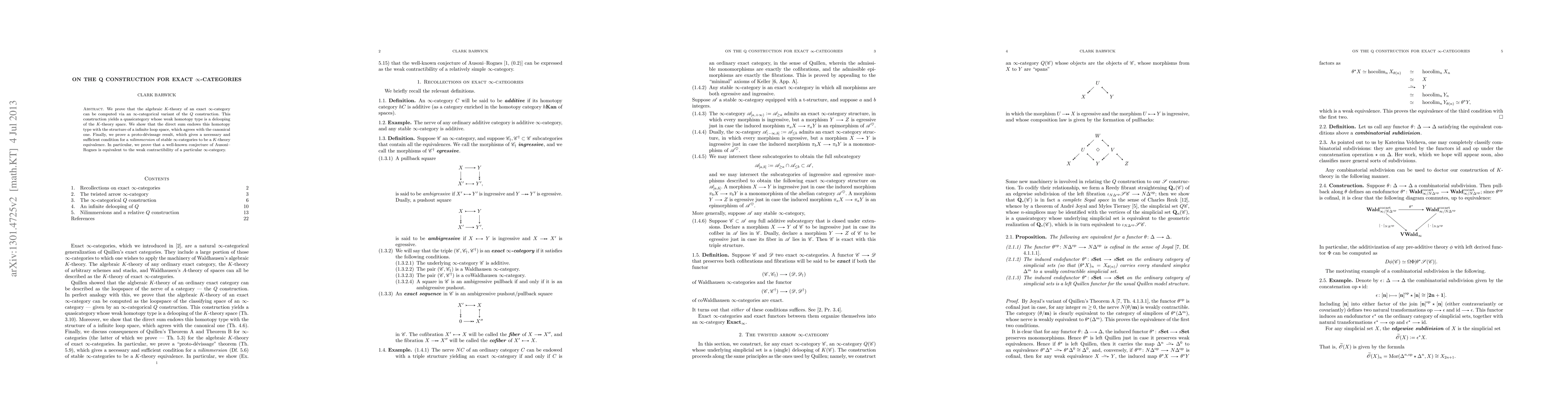 We prove that the K-theory of an exact quasicategory can be computed via a higher categorical variant of the Q construction. This construction yields a quasicategory whose weak homotopy type is a delooping of the K-theory space. We show that the direct sum endows this homotopy type with the structure of a infinite loop space, which agrees with the canonical one. Finally, we prove a proto-devissage result, which gives a necessary and sufficient condition for a "nilimmersion" of stable quasicategories to be a K-theory equivalence. In particular, we prove that a well-known conjecture of Ausoni and Rognes is equivalent to the weak contractibility of a particular quasicategory.