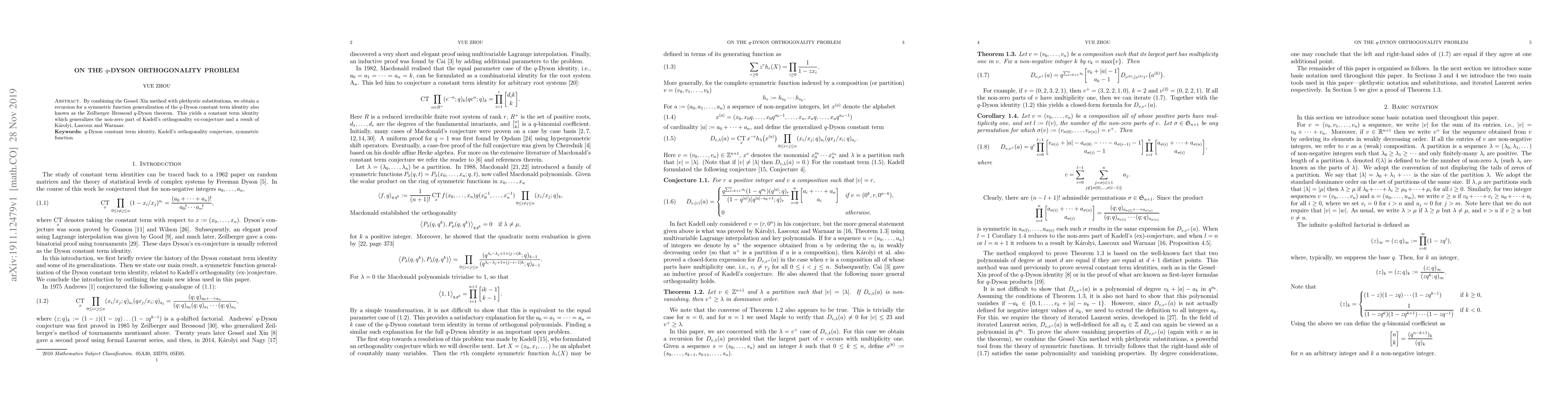 The paper introduces a novel approach to the q-Dyson orthogonality problem, yielding a generalized constant term identity via a recursion involving symmetric functions and plethystic substitutions.