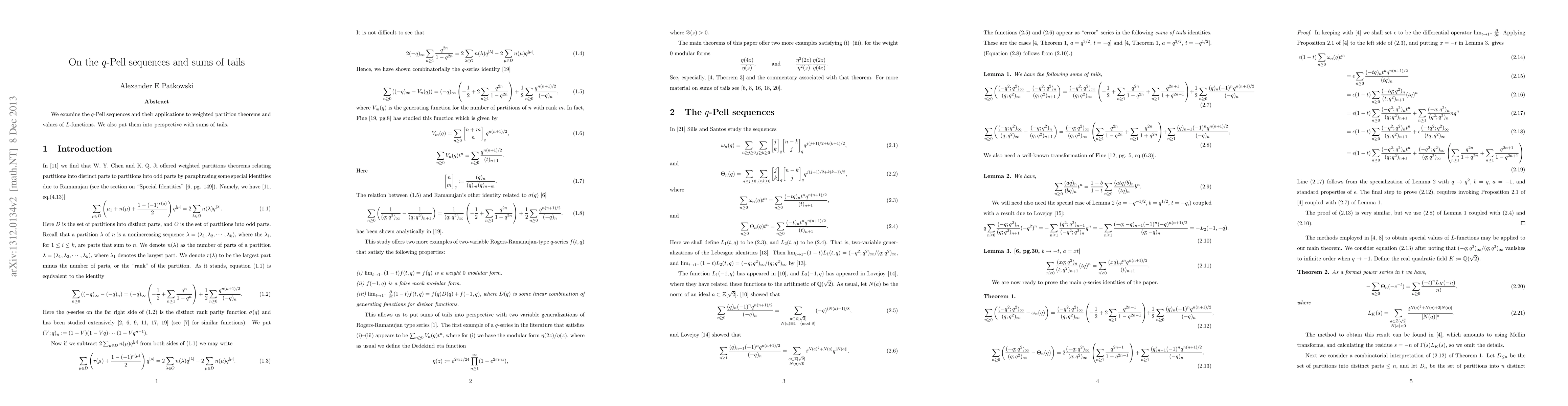 This paper explores $q$-Pell sequences and their relevance in weighted partition theorems and $L$-function values, while also analyzing their relationship with sums of tails. The study highlights connections between these sequences and advanced number theory concepts.