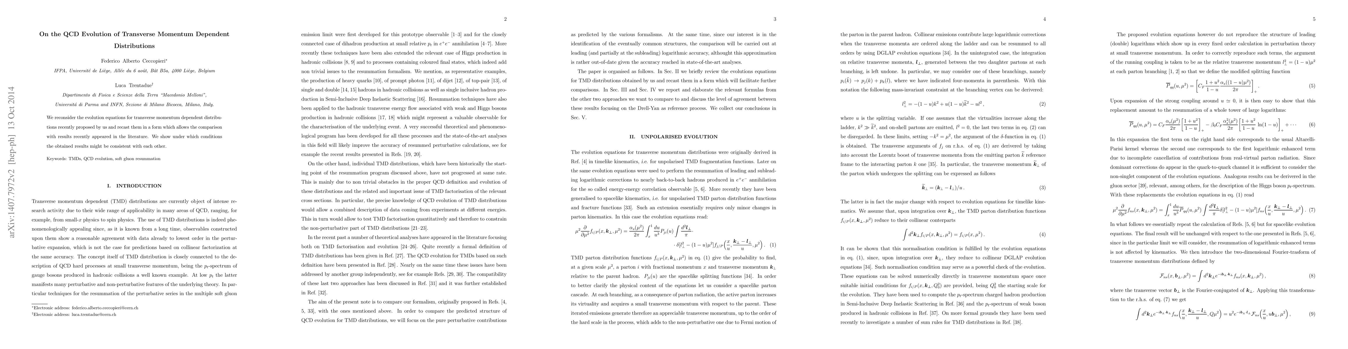 We reconsider the evolution equations for transverse momentum dependent distributions recently proposed by us and recast them in a form which allows the comparison with results recently appeared in the literature. We show under which conditions the obtained results might be consistent with each other.