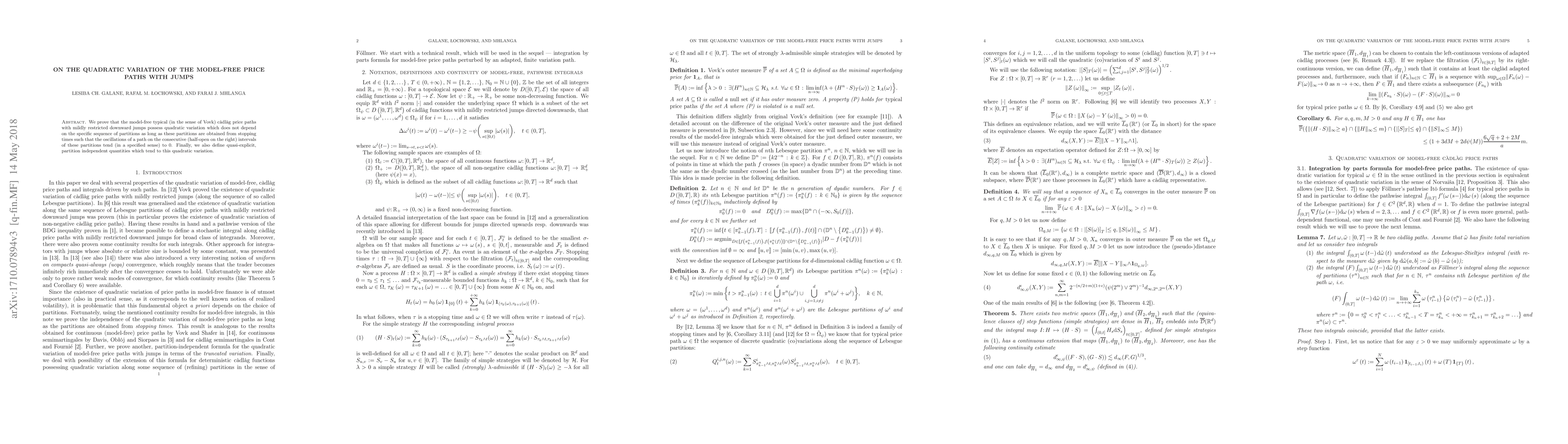 This paper demonstrates that model-free c\`adl\`ag price paths with mildly restricted downward jumps have a quadratic variation independent of specific partition sequences, provided the partitions are derived from stopping times. It also introduces quasi-explicit, partition-independent quantities that converge to this quadratic variation.