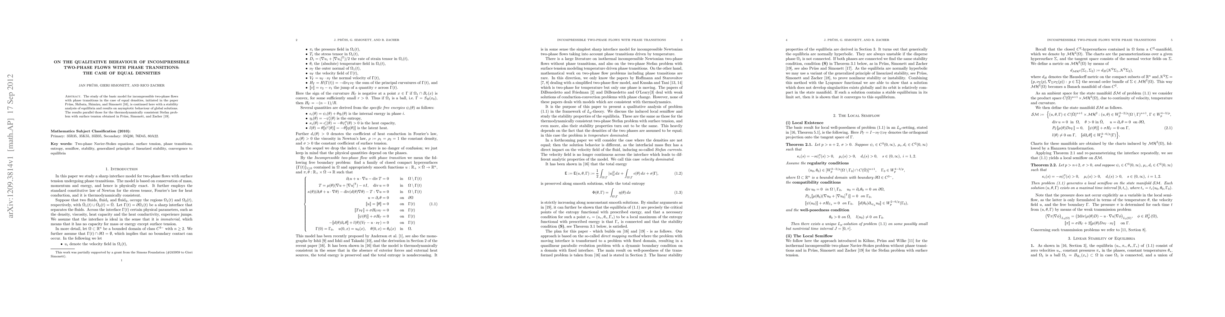 This paper continues the study of incompressible two-phase flows with phase transitions, focusing on equal densities, and provides a stability analysis of equilibria and examines the asymptotic behavior of global solutions, paralleling results from the thermodynamically consistent Stefan problem.