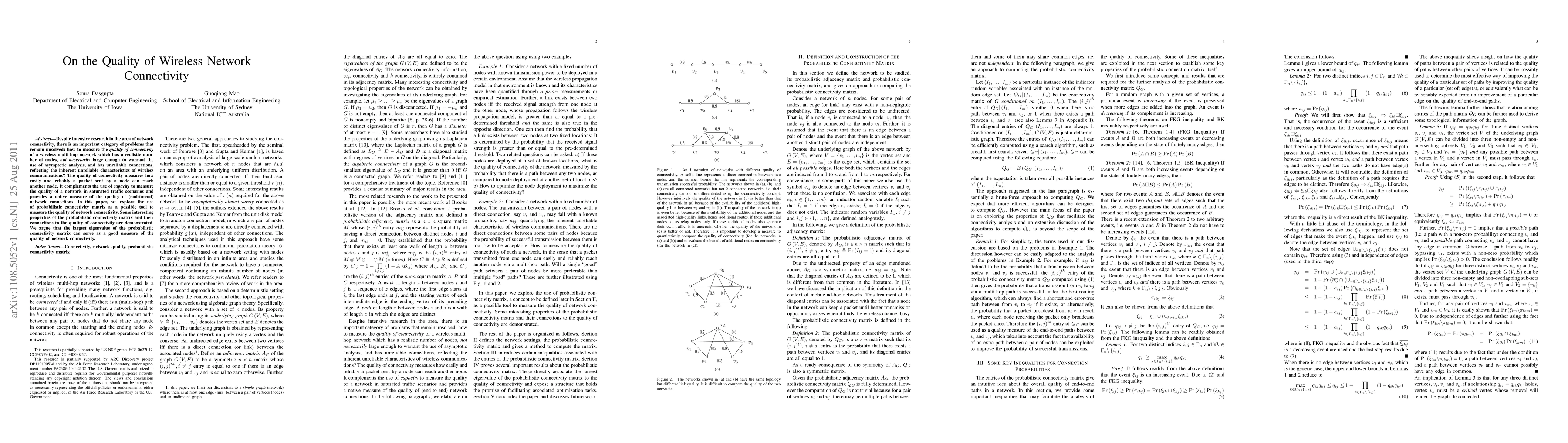 Despite intensive research in the area of network connectivity, there is an important category of problems that remain unsolved: how to measure the quality of connectivity of a wireless multi-hop network which has a realistic number of nodes, not necessarily large enough to warrant the use of asymptotic analysis, and has unreliable connections, reflecting the inherent unreliable characteristics of wireless communications? The quality of connectivity measures how easily and reliably a packet sent by a node can reach another node. It complements the use of \emph{capacity} to measure the quality of a network in saturated traffic scenarios and provides a native measure of the quality of (end-to-end) network connections. In this paper, we explore the use of probabilistic connectivity matrix as a possible tool to measure the quality of network connectivity. Some interesting properties of the probabilistic connectivity matrix and their connections to the quality of connectivity are demonstrated. We argue that the largest eigenvalue of the probabilistic connectivity matrix can serve as a good measure of the quality of network connectivity.