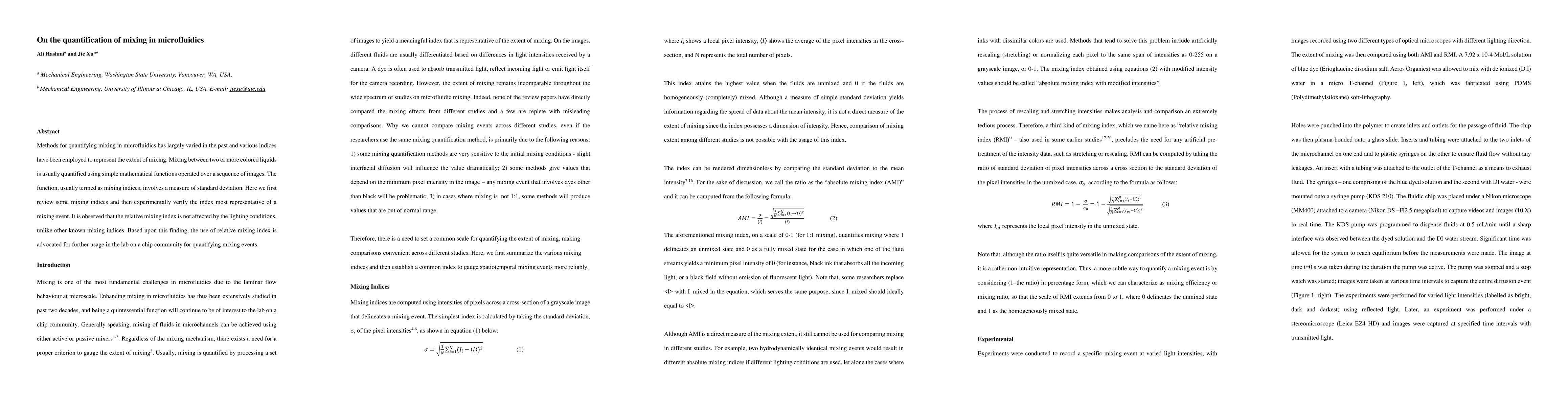 Methods for quantifying mixing in microfluidics have varied largely in the past, and various indices have been employed to represent the extent of mixing. Mixing between two or more colored liquids is usually quantified using simple mathematical functions operated over a sequence of images. The function, usually termed mixing indices, involves a measure of standard deviation. Here, we first review some mixing indices and then experimentally verify the index most representative of a mixing event. It is observed that the relative mixing index is not affected by the lighting conditions, unlike other known mixing indices. Based on this finding, the use of a relative mixing index is advocated for further use in the lab-on-a-chip community for quantifying mixing events.
