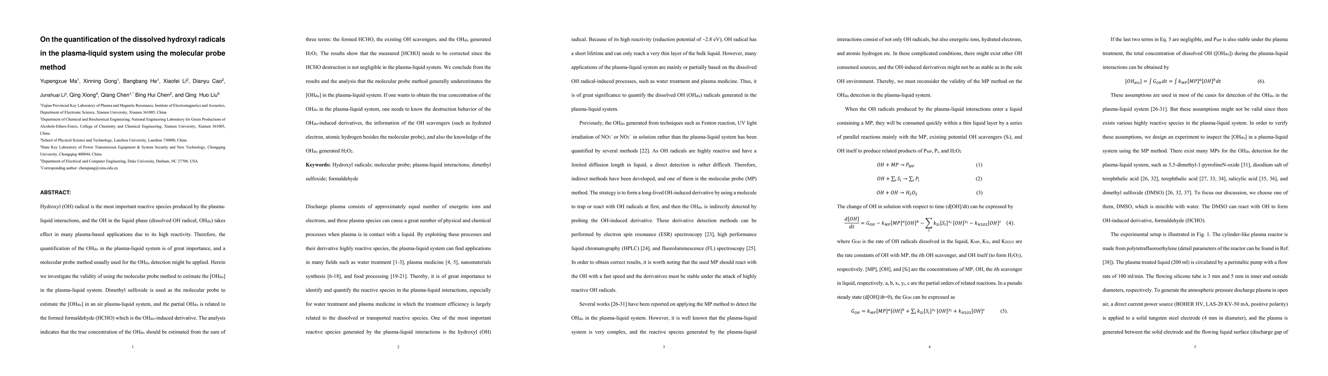 Hydroxyl (OH) radical is the most important reactive species produced by the plasma-liquid interactions, and the OH in the liquid phase (dissolved OH radical, OHdis) takes effect in many plasma-based applications due to its high reactivity. Therefore, the quantification of the OHdis in the plasma-liquid system is of great importance, and a molecular probe method usually used for the OHdis detection might be applied. Herein we investigate the validity of using the molecular probe method to estimate the [OHdis] in the plasma-liquid system. Dimethyl sulfoxide is used as the molecular probe to estimate the [OHdis] in an air plasma-liquid system, and the partial OHdis is related to the formed formaldehyde (HCHO) which is the OHdis-induced derivative. The analysis indicates that the true concentration of the OHdis should be estimated from the sum of three terms: the formed HCHO, the existing OH scavengers, and the OHdis generated H2O2. The results show that the measured [HCHO] needs to be corrected since the HCHO destruction is not negligible in the plasma-liquid system. We conclude from the results and the analysis that the molecular probe method generally underestimates the [OHdis] in the plasma-liquid system. If one wants to obtain the true concentration of the OHdis in the plasma-liquid system, one needs to know the destruction behavior of the OHdis-induced derivatives, the information of the OH scavengers (such as hydrated electron, atomic hydrogen besides the molecular probe), and also the knowledge of the OHdis generated H2O2.