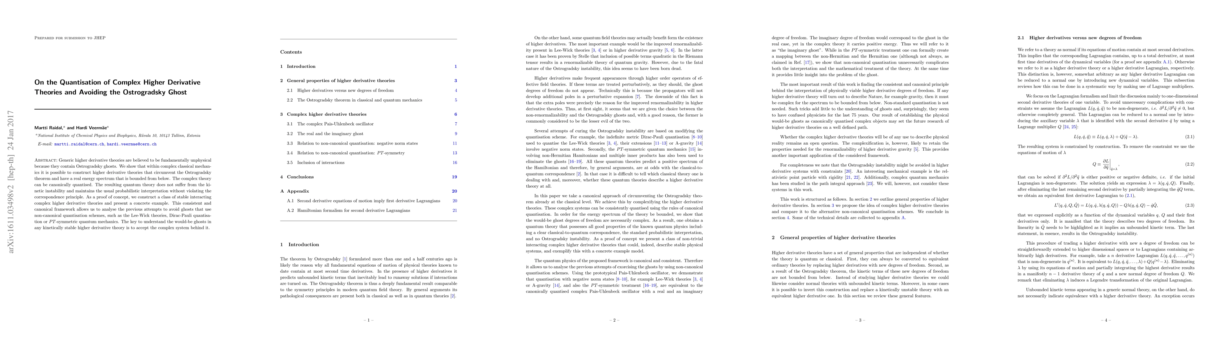 Generic higher derivative theories are believed to be fundamentally unphysical because they contain Ostrogradsky ghosts. We show that within complex classical mechanics it is possible to construct higher derivative theories that circumvent the Ostrogradsky theorem and have a real energy spectrum that is bounded from below. The complex theory can be canonically quantised. The resulting quantum theory does not suffer from the kinetic instability and maintains the usual probabilistic interpretation without violating the correspondence principle. As a proof of concept, we construct a class of stable interacting complex higher derivative theories. This consistent and canonical framework allows us to analyse previous attempts to avoid the ghosts that use non-canonical quantisation schemes, such as the Lee-Wick theories, Dirac-Pauli quantisation or PT-symmetric quantum mechanics. The key to understand the would-be ghosts in any kinetically stable higher derivative theory is to accept the complex system behind it.