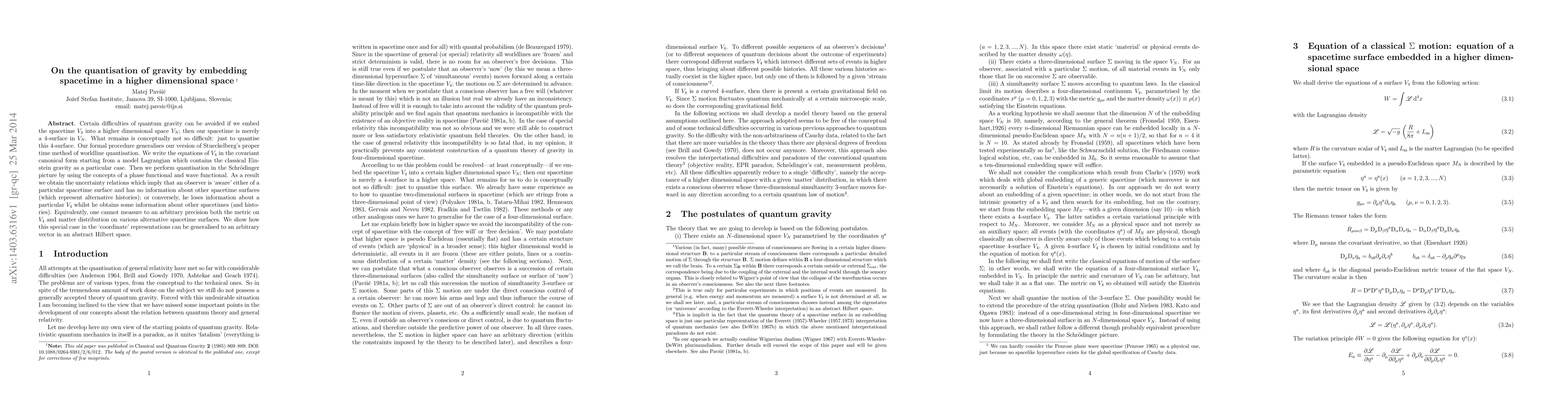Certain difficulties of quantum gravity can be avoided if we embed the spacetime $V_4$ into a higher dimensional space $V_N$; then our spacetime is merely a 4-surface in $V_N$.What remains is conceptually not so difficult: just to quantise this 4-surface. Our formal procedure generalises our version of Stueckelberg's proper time method of worldline quantisation. We write the equations of $V_4$ in the covariant canonical form starting from a model Lagrangian which contains the classical Einstein gravity as a particular case. Then we perform quantisation in the Schr\"odinger picture by using the concepts of a phase functional and wave functional. As a result we obtain the uncertainty relations which imply that an observer is `aware' either of a particular spacetime surface and has no information about other spacetime surfaces (which represent alternative histories); or conversely, he loses information about a particular $V_4$ whilst he obtains some information about other spacetimes (and histories). Equivalently, one cannot measure to an arbitrary precision both the metric on $V_4$ and matter distribution on various alternative spacetime surfaces. We show how this special case in the `coordinate' representations can be generalised to an arbitrary vector in an abstract Hilbert space.