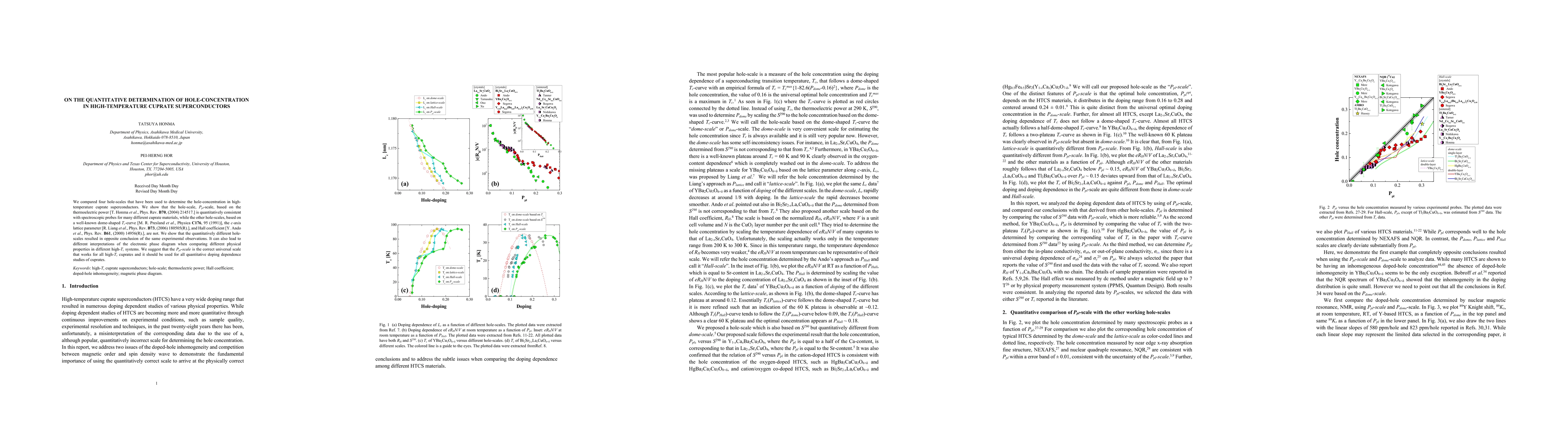 We compared four hole-scales that have been used to determine the hole-concentration in high-temperature cuprate superconductors. We show that the hole-scale, $P_{pl}$-scale, based on the thermoelectric power [T. Honma $et$ $al$., Phys. Rev. B70, (2004) 214517.] is quantitatively consistent with spectroscopic probes for many different cuprate materials, while the other hole-scales, based on a well-known dome-shaped $T_c$-curve [M. R. Presland $et$ $al$., Physica C176, 95 (1991)], the $c$-axis lattice parameter [R. Liang $et$ $al$., Phys. Rev. B73, (2006) 180505(R).], and Hall coefficient [Y. Ando $et$ $al$., Phys. Rev. B61, (2000) 14956(R).], are not. We show that the quantitatively different hole-scales resulted in opposite conclusion of the same experimental observations. It can also lead to different interpretations of the electronic phase diagram when comparing different physical properties in different high-$T_c$ systems. We suggest that the $P_{pl}$-scale is the correct universal scale that works for all high-$T_c$ cuprates and it should be used for all quantitative doping dependence studies of cuprates.