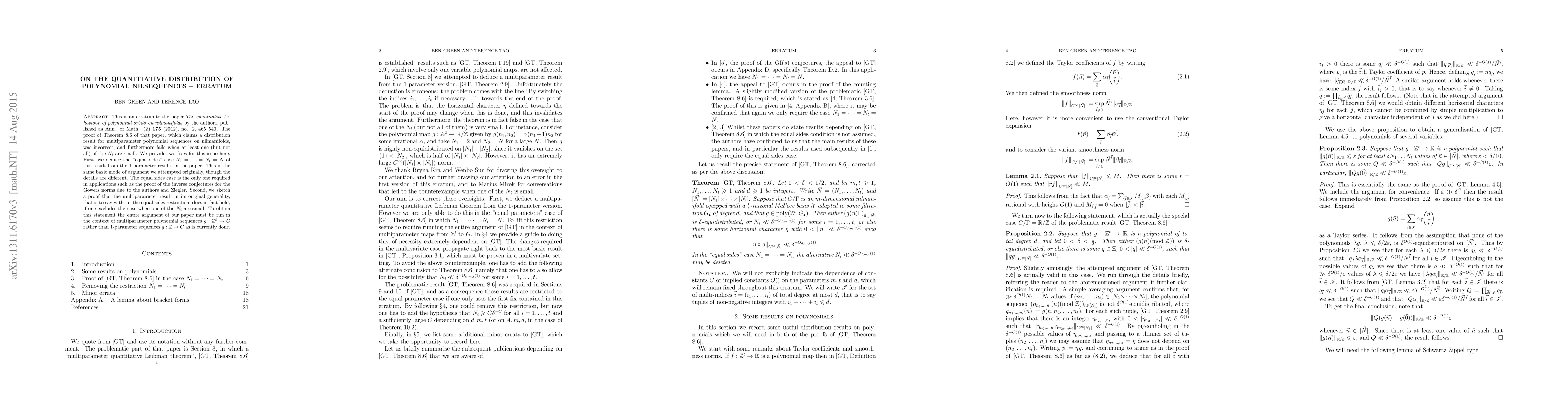 This is an erratum to 'On the quantitative distribution of polynomial nilsequences' [GT]. The proof of Theorem 8.6 of that paper, which claims a distribution result for multiparameter polynomial sequences on nilmanifolds, was incorrect. We provide two fixes for this issue here. First, we deduce the "equal sides" case $N_1 = \dots = N_t = N$ of [GT, Theorem 8.6] from the 1-parameter results in [GT]. This is the same basic mode of argument we attempted in the original paper, though the details are different. The equal sides case is the only one required in applications such as the proof of the inverse conjectures for the Gowers norms due to the authors and Ziegler. Second, we sketch a proof that [GT, Theorem 8.6] does in fact hold in its originally stated form, that is to say without the equal sides condition. To obtain this statement the entire argument of [GT] must be run in the context of multiparameter polynomial sequences $g : \mathbb{Z}^t \rightarrow G$ rather than 1-parameter sequences $g : \mathbb{Z} \rightarrow G$ as is currently done.