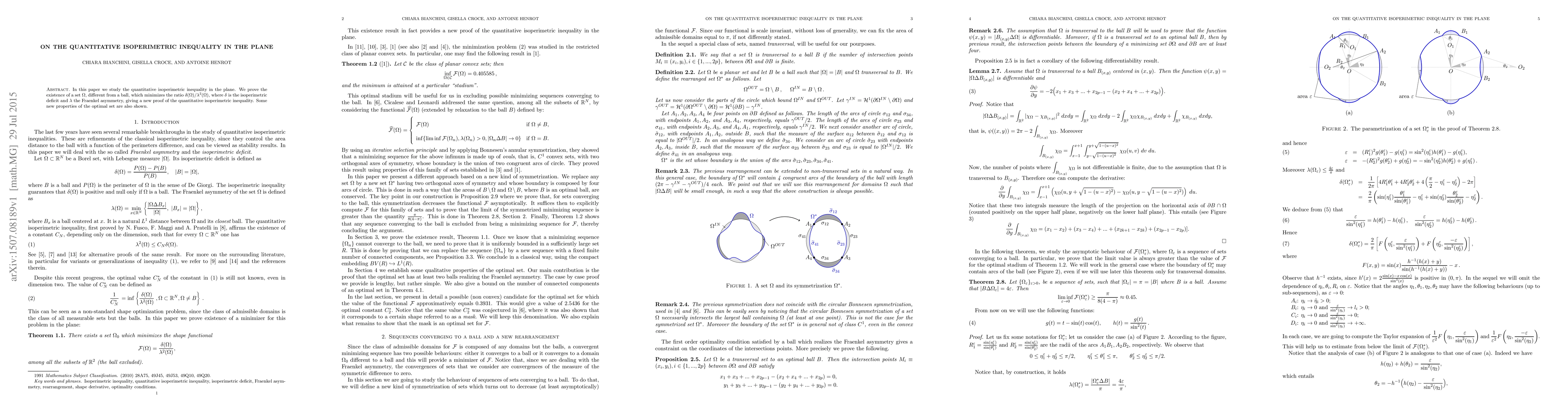 This paper proves the existence of a non-ball set that minimizes the ratio of isoperimetric deficit to the square of Fraenkel asymmetry, providing a new proof for the quantitative isoperimetric inequality in the plane and revealing new properties of the optimal set.