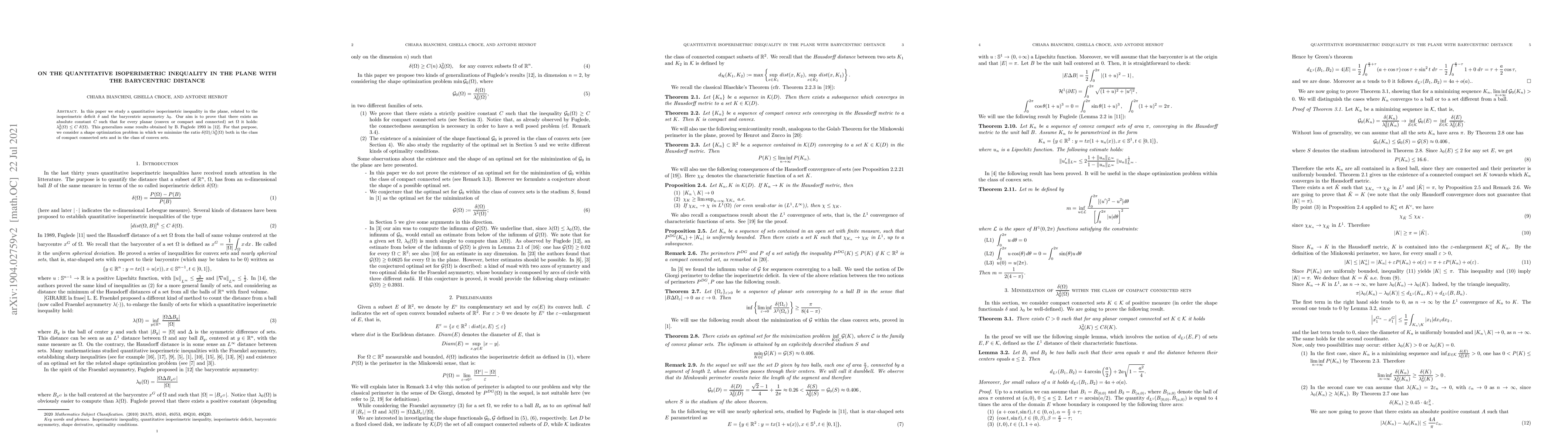 This paper explores the quantitative isoperimetric inequality in the plane using the barycentric distance, aiming to generalize B. Fuglede's results. It investigates the optimization problem to minimize the ratio of the isoperimetric deficit to the square of the barycentric asymmetry for both general and convex sets.